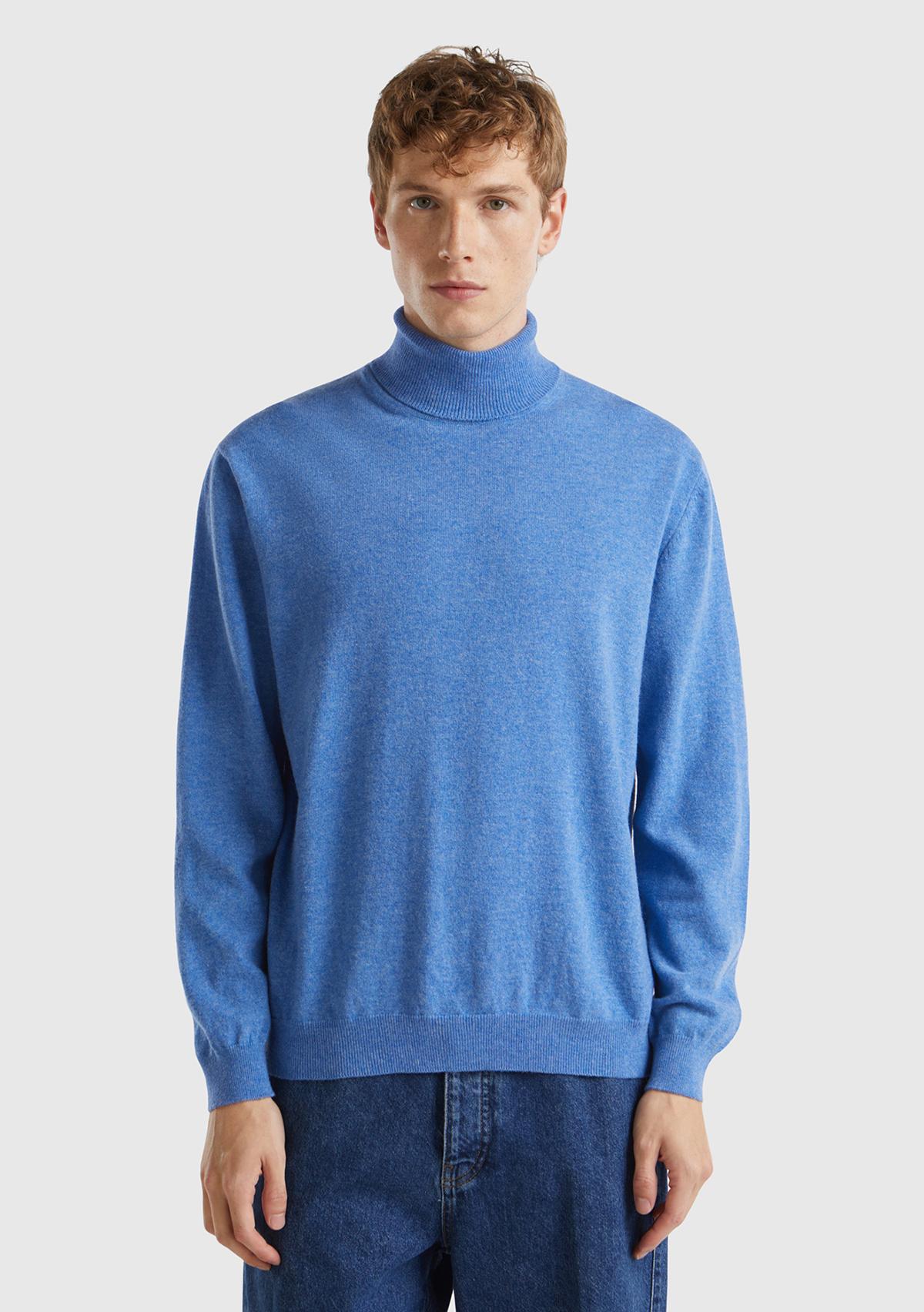 Erkek Mavi Melanj Boğazlı %100 Merino Kazak. Koyun Yünü İçerir