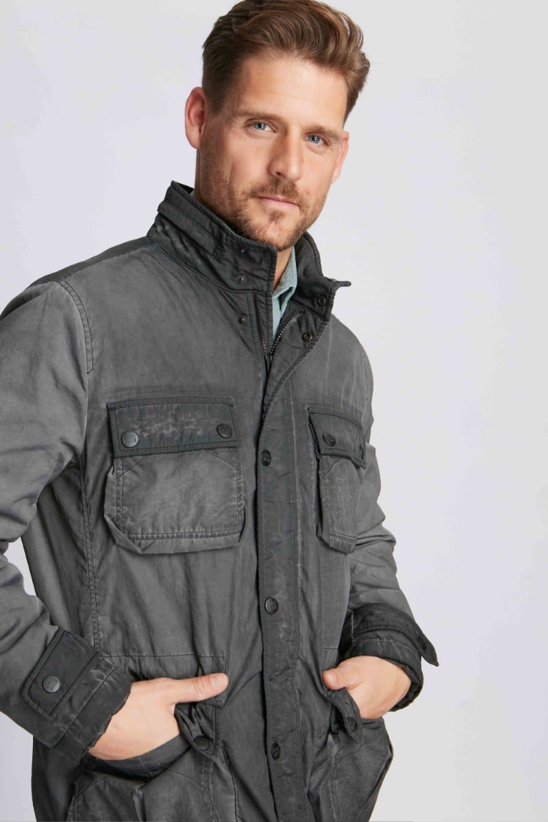 Dik yaka, fermuar ve çıt çıt kapatmalı, belde kordonlu, gizli kapişonlu ve 5 adet cepli mont.