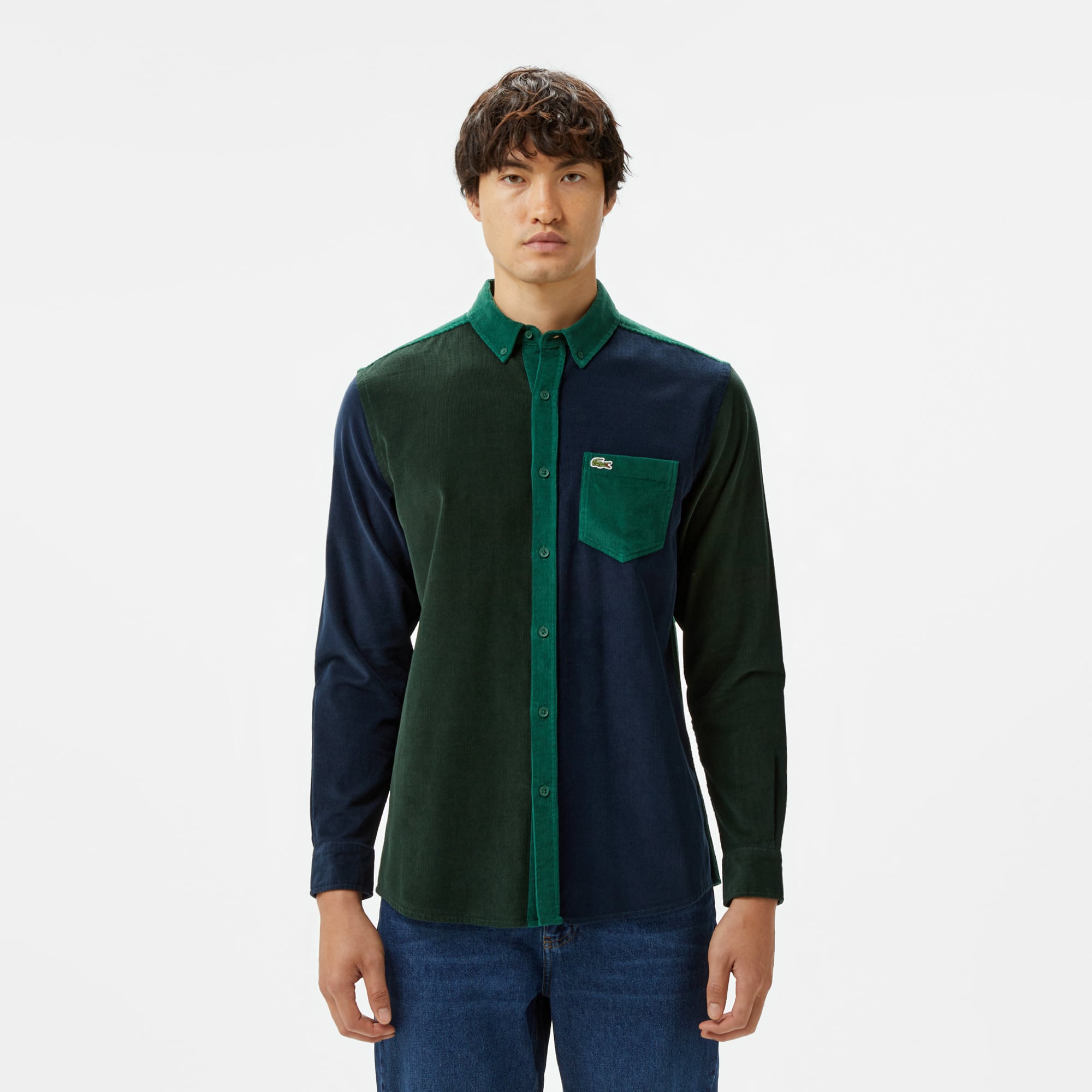 Erkek Regular Fit Düğmeli Yaka Renk Bloklu Koyu Yeşil Gömlek