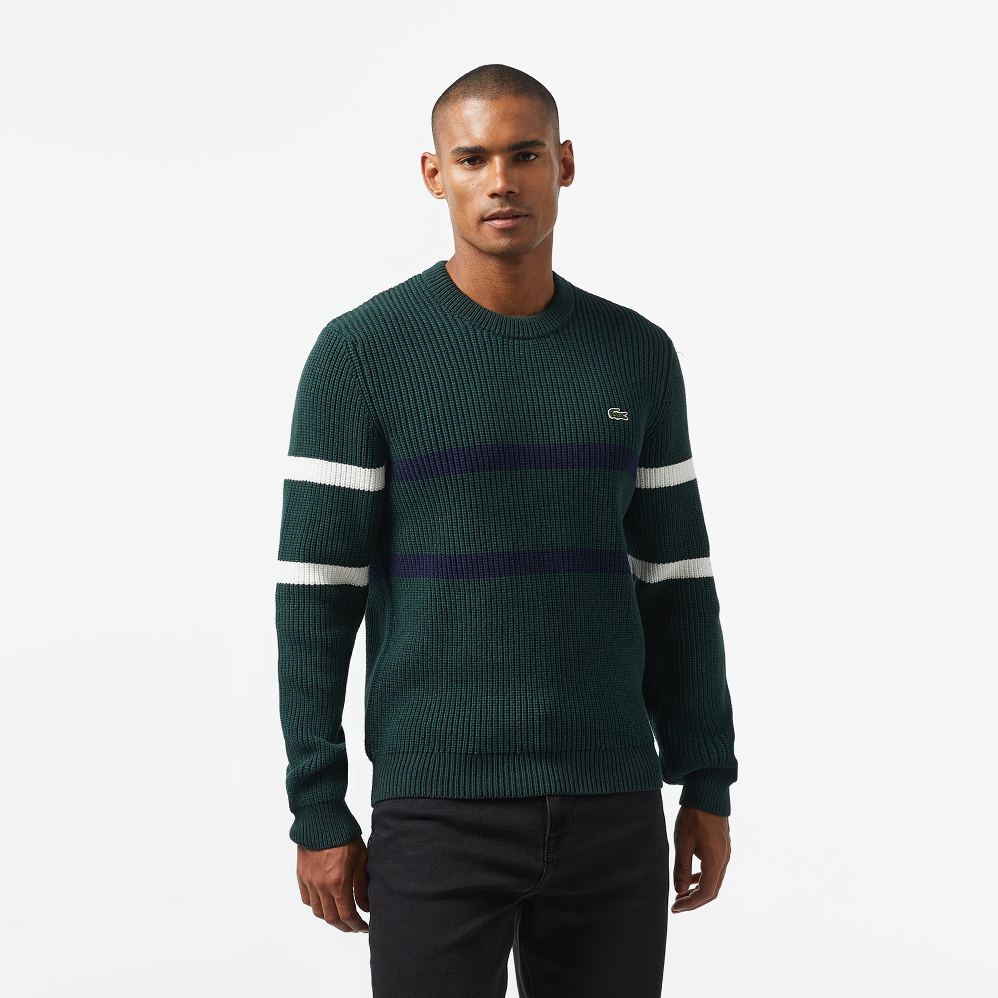 Erkek Relaxed Fit Bisiklet Yaka Çizgili Koyu Yeşil Kazak