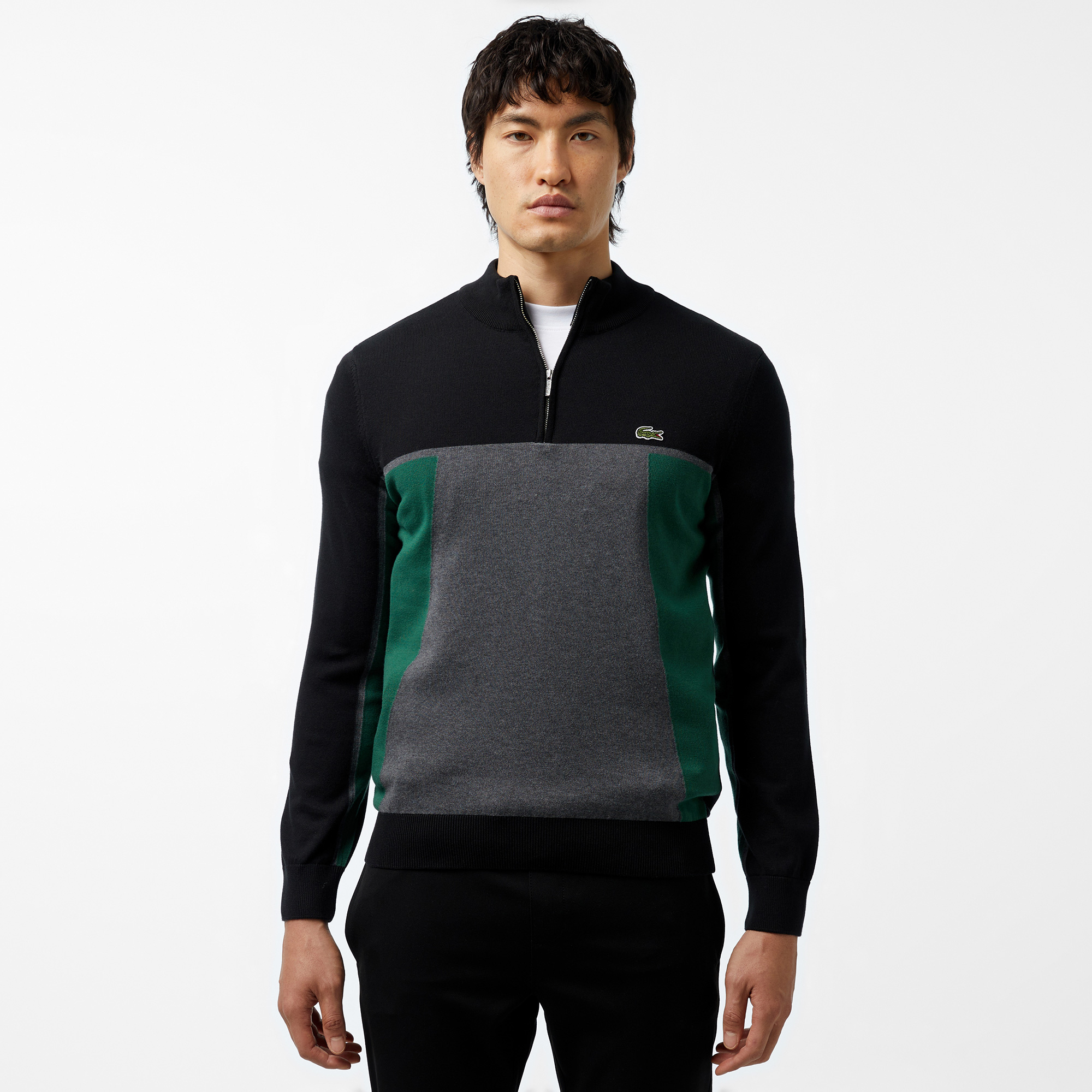 Erkek Relaxed Fit Yarım Fermuarlı Renk Bloklu Siyah Kazak