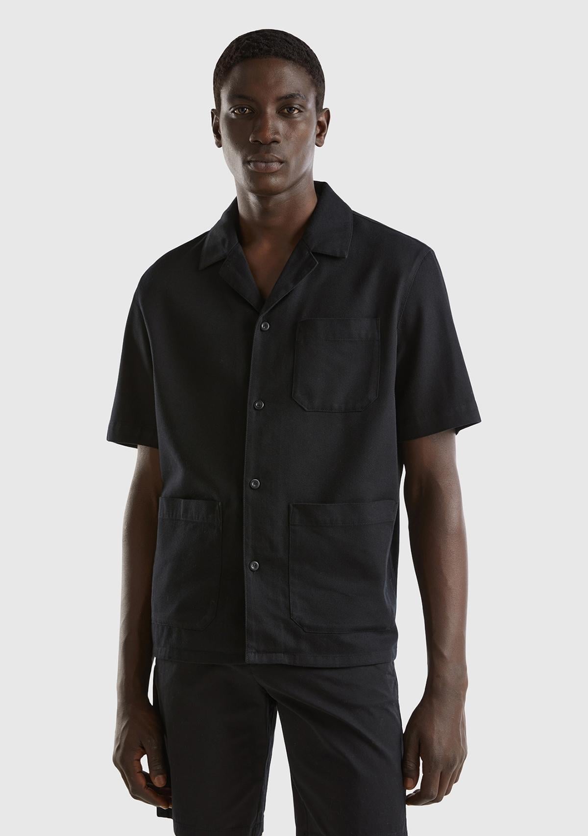 Erkek Siyah Pamuk Karışımlı Cep Detaylı Bowling Yaka Kısa Kollu Gömlek