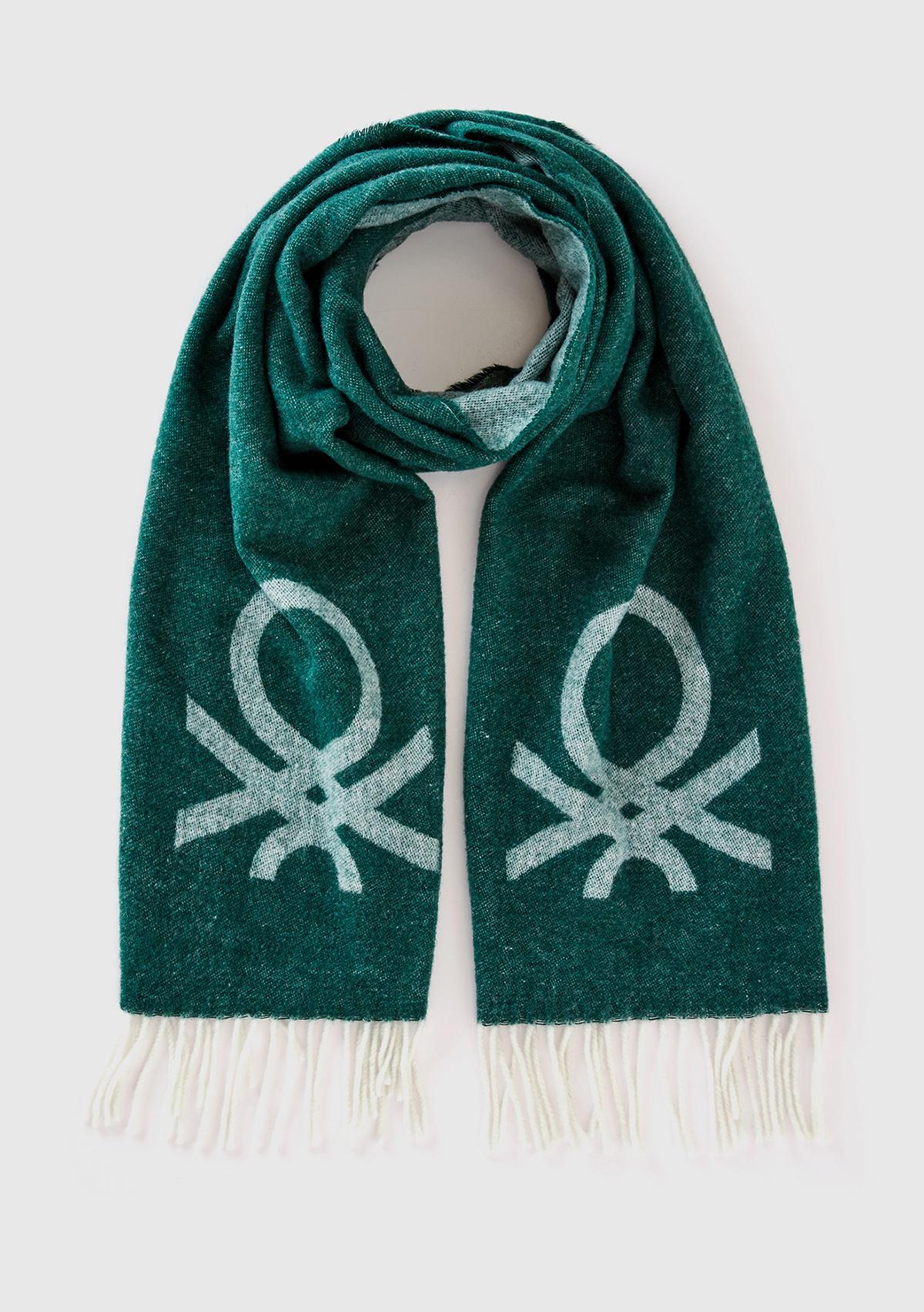 Erkek Yeşil Yün Karışımlı Kontrast Renkli Logo Baskılı Atkı