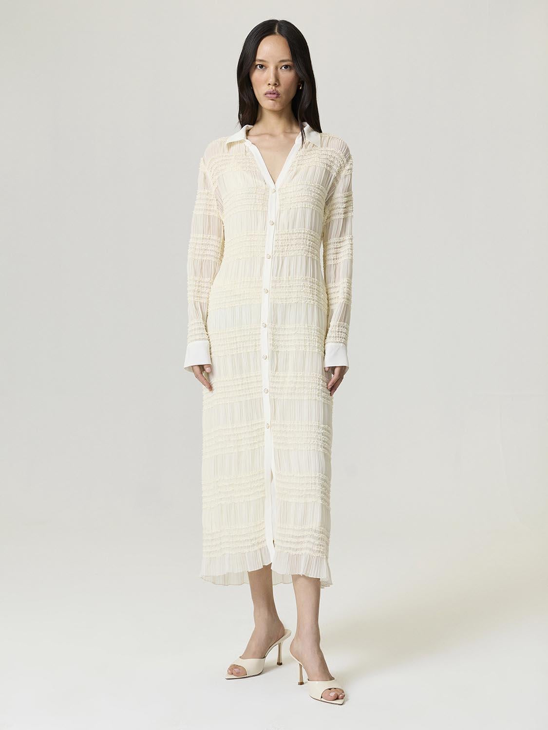Sofistike ve eğlenceli bu fırfır detaylı uzun elbise, normal kesim silüetinde dokuma kumaştan üretilmiştir. Gömlek yakası, uzun kolları ve önden düğmeli tasarımıyla zamansız bir terzilik anlayışını kadınsı bir çekicilikle birleştiriyor. Kat kat fırfır detayları hareket ve zarafet katarken, uzun boyu zarif bir görünüm sunuyor. Hem gündüz hem de akşam etkinlikleri için mükemmel olan bu elbise, ofis şıklığından özel toplantılara kadar çok yönlü bir stil sunuyor. Kalıp: Regular Fit Model Ürün Bedeni: S