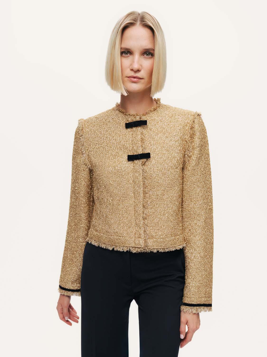 Zarif dokusu ve feminen detaylarıyla öne çıkan bu tüvit ceket, klasik görünümüne modern bir dokunuş kazandırır. Regular fit kalıbı sayesinde vücuda otururken rahat bir kullanım sunar. Sıfır yakası ve biyeli kenar detayları ile şık bir çerçeve oluşturur. Fiyonk aksesuarı, tasarıma romantik bir hava katarken ince işçiliğiyle dikkat çeker. Uzun kollu yapısı ve dokuma kumaşıyla mevsim geçişleri için ideal olan bu tüvit ceket, hem klasik hem zarif kombinlerin tamamlayıcısıdır. Kalıp: Regular Fit Model Ürün Bedeni: S Model Bedeni: Boy 1.77 / Göğüs 82 cm / Bel 61 cm / Kalça 89 cm