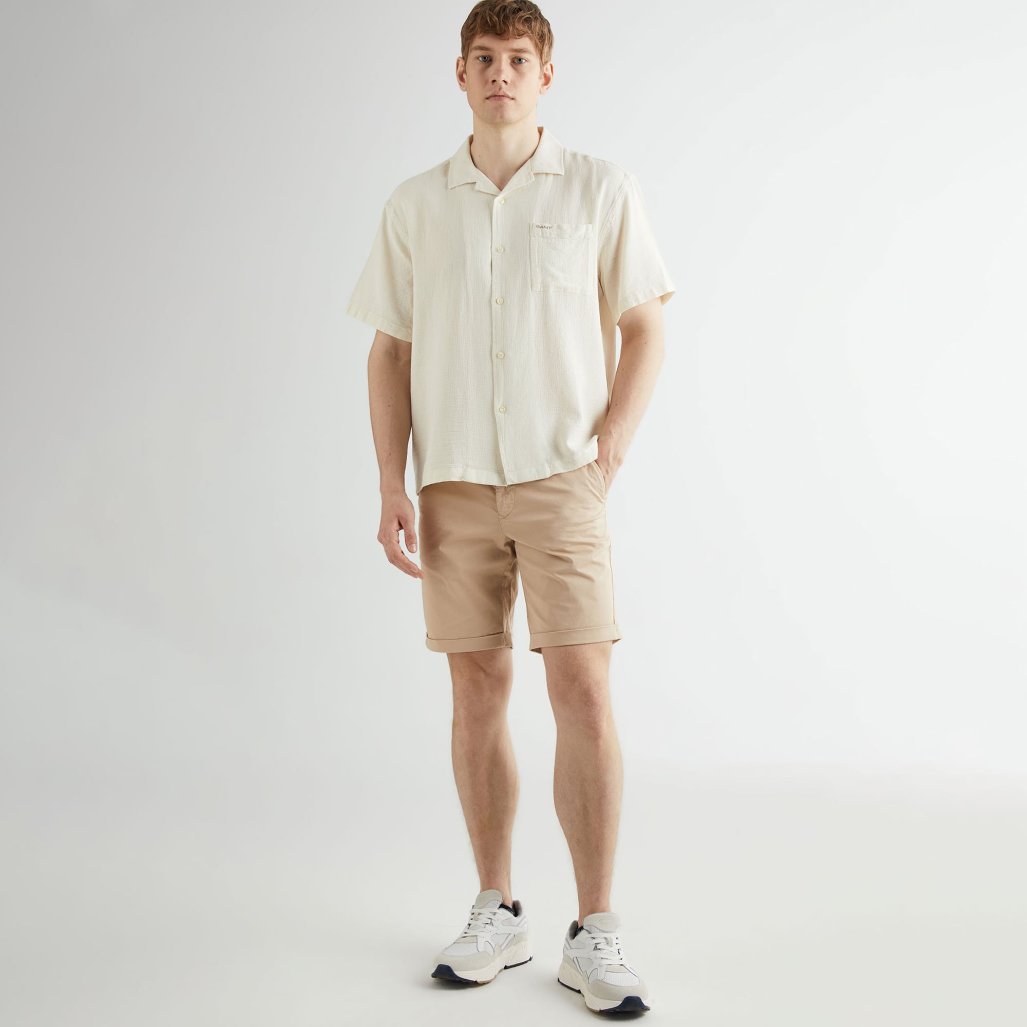 Bu chino şort özel bir boya ile yıkanarak güneşte solmuş bir görünüm elde edilmiştir. İnce pamuklu tivil ve esnek pamuk karışımından üretilen bu şort, regular fit kesime ve orta bele sahiptir. Ayrıntılar arasında önden düğmeli kapama, önden eğimli cepler, katlanabilir paça ve korozo düğmeler yer alır. Giymesi rahat ve sıkça başvuracağınız bir temel parça olarak yaz boyunca sıkça tercih edebilirsiniz.