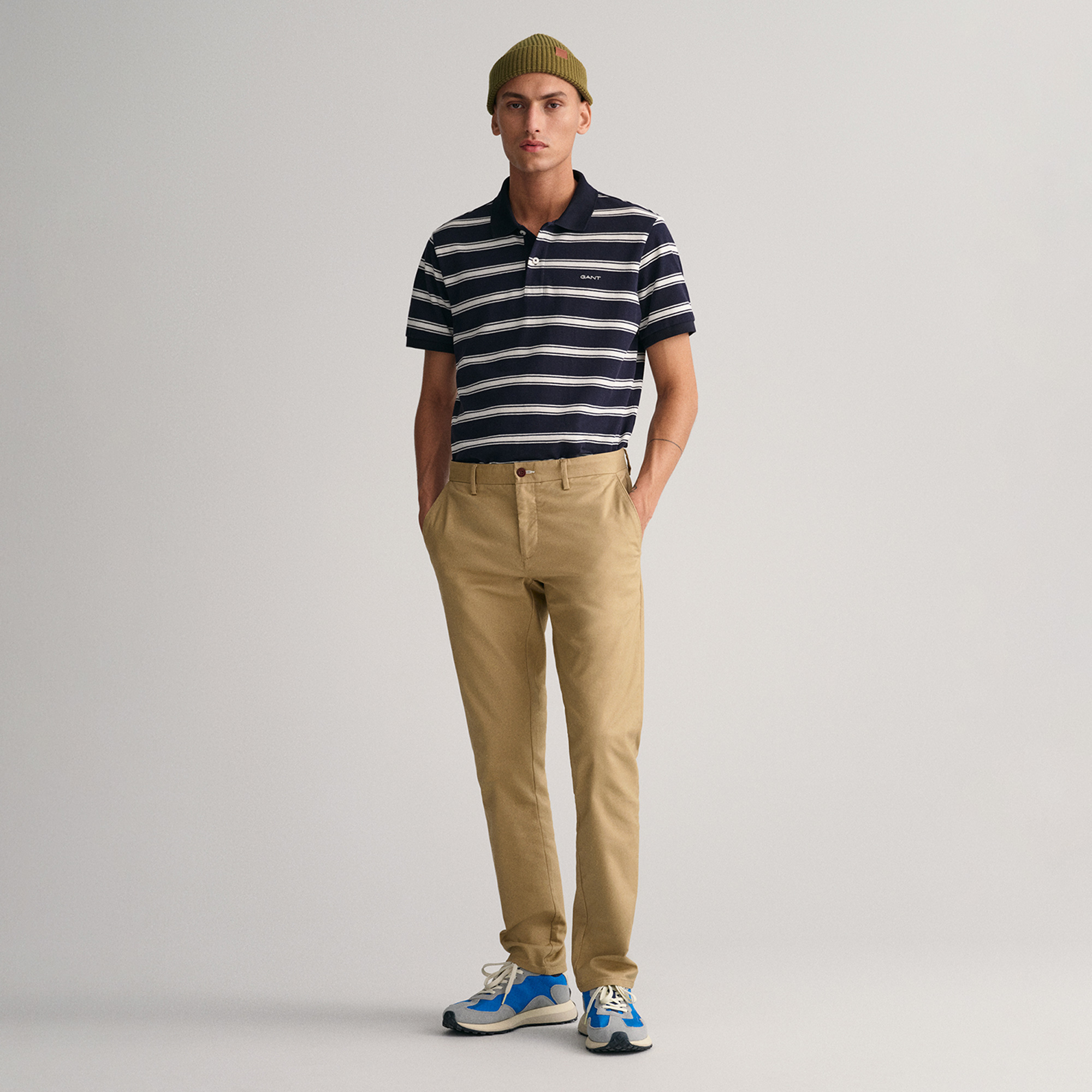 Nefes alabilir ve nem emici özelliklere sahip bu imza chino pantolon, orta bel kesimi ve kalçadan paçaya kadar daralan kalıbıyla şıklığınızı vurgular. Zarif ve modern bir görünüm sunan bu pantolon, sevilen preppy tarzına yenilikçi bir dokunuş getirir. Detaylarında düğmeli ön kapanış, eğimli ön cepler, kemer halkaları ve arka cepte GANT etiketi bulunur. En aktif günleriniz için mükemmel olan bu chino, sizi serin ve rahat tutarak gün boyu konfor sağlar. Benzer renklerle yıkayın. Ters çevrilerek yıkayın ve ütüleyin, yumuşatıcı kullanmayın. Detaylı bakım talimatları için ürün etiketini kontrol edin.
