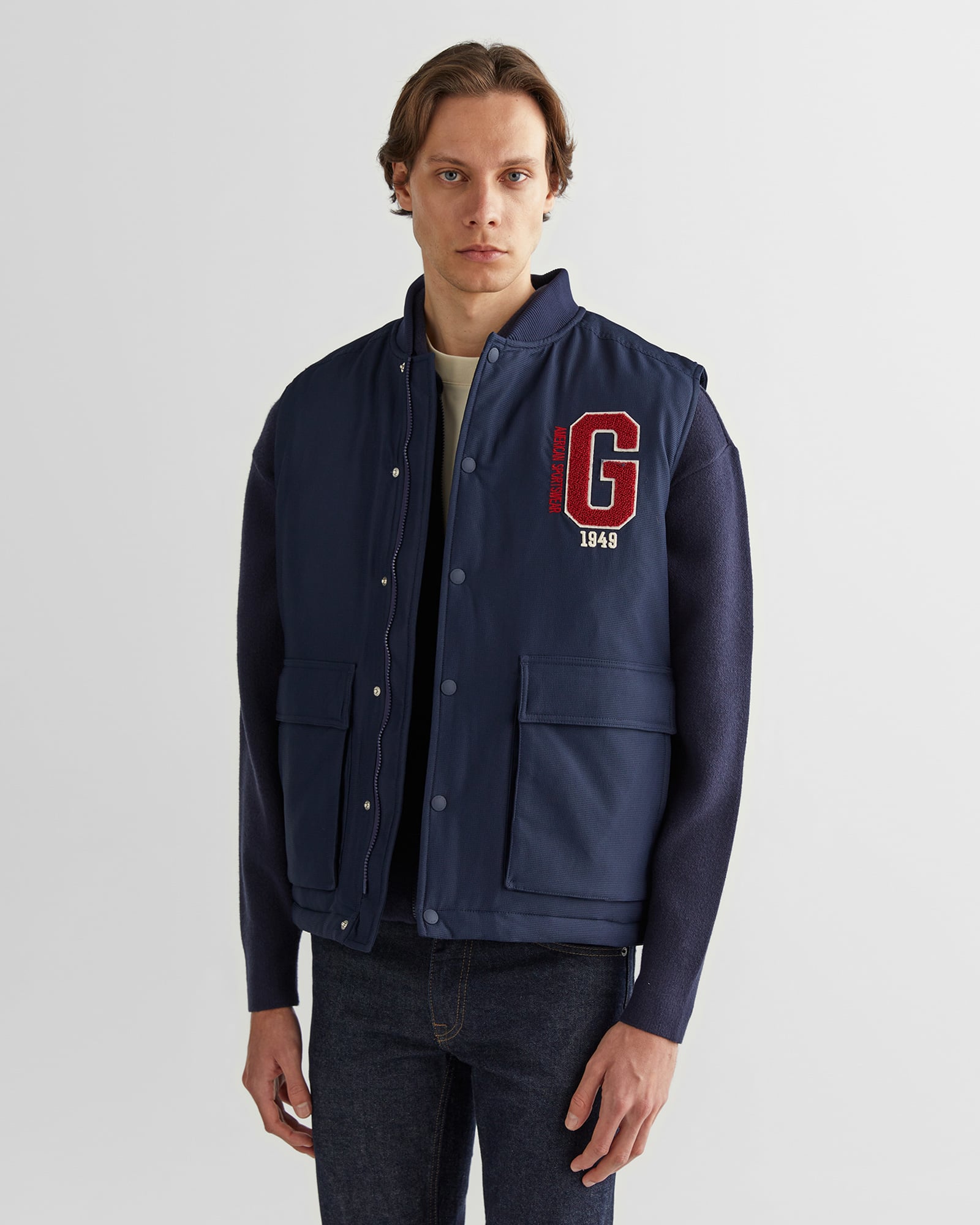 Sportif ve klasik tarzı bir araya getiren bu hakim yaka fermuarlı yelek, rahat kesimi ve şık detaylarıyla dikkat çekiyor. Yumuşak dokulu kumaşı sayesinde konforlu bir kullanım sunarken dolgulu yapısı ekstra sıcaklık sağlar. Göğüs üzerindeki büyük "G" harfli logo detayı vintage bir hava katarken çıtçıtlı ve fermuarlı kapanışı pratik kullanım sunar. Geniş cepleri ile fonksiyonelliği artıran bu yelek, katmanlı kombinler için mükemmel bir tamamlayıcıdır.