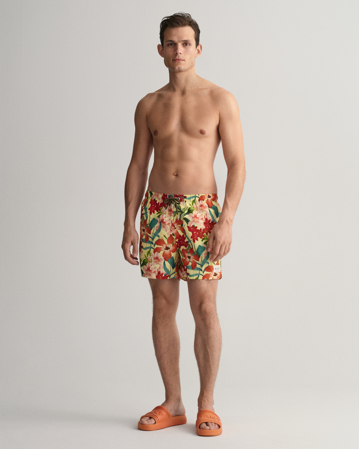 Geri dönüştürülmüş polyesterden üretilen classic fit çiçek desenli yüzme şortu, klasik uzunluğa sahiptir. Kontrast renkli ipli elastik bel bandına, yan ceplere ve cırt cırtlı arka cebe sahiptir. Bu giymesi kolay yüzme şortu, file iç pantolona ve sol alt bacağa dikilmiş dokuma GANT logosuna sahiptir.