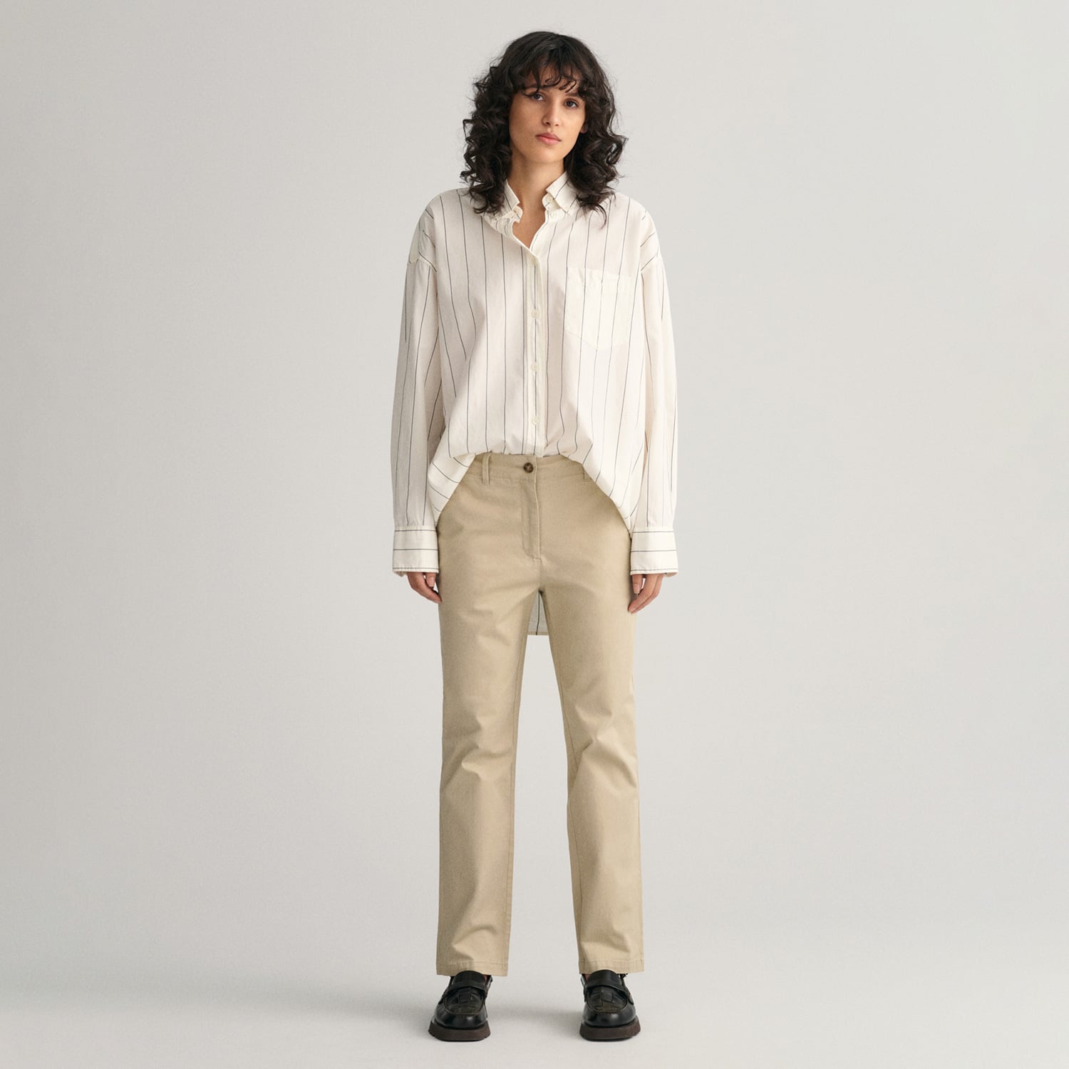 Dar bir siluet ve cropped bir uzunluğa sahip olan bu orta bel yükseklikte chino pantolonlar, esnekliği sağlamak için pamuktan üretilmiştir. Yumuşak bir dokunuş hissine sahip olan bu pantolonlar, eğik ön ceplere, markalı düğmelere ve arka düz cebinde tonal nakışa sahiptir.