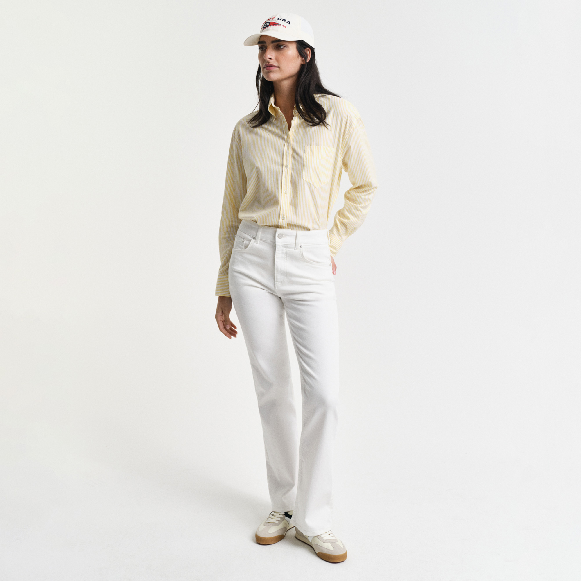 Denim gardırobuna taze bir dokunuş katacak bu modern ve sofistike beyaz jean, temiz ve net çizgileriyle dikkat çekiyor. Slim fit kesimiyle vücuda mükemmel otururken orta bel tasarımı ve kısa paçalı bol kesimiyle feminen ve şık bir siluet sunuyor. Pamuk ve elastan karışımlı kumaşı sayesinde yumuşak bir his ve yüksek esneklik sağlayarak gün boyu konfor sunuyor. Arka kemerde yer alan GANT etiketi ise tasarımı tamamlayan zarif detaylar arasında yer alıyor.