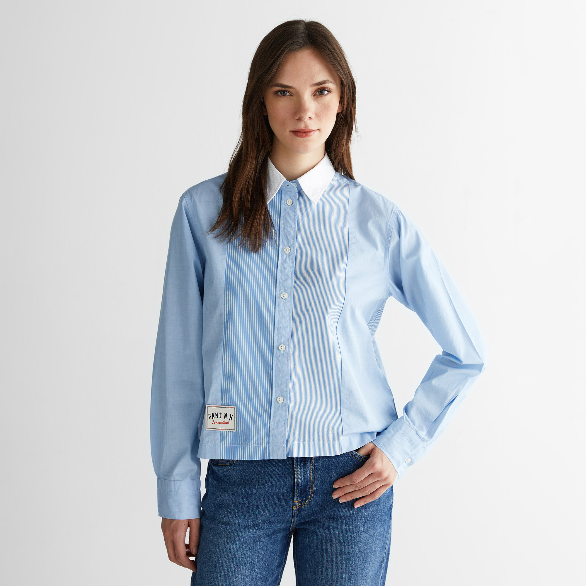 GANT gömlek, klasik çizgili deseni modern detaylarla buluşturarak zamansız bir şıklık sunuyor. Hafif ve nefes alabilen kumaşı sayesinde gün boyu konfor sağlarken cropped kesimi ile modern ve dinamik bir stil oluşturuyor. Kontrast renkli klasik yaka ve düğmeli ön tasarım, modele sofistike bir hava katıyor ve farklı yönlerde yerleştirilmiş ince ve kalın çizgiler modern bir dokunuş ekliyor. Etek kısmında bulunan GANT logosu ise premium tarzı vurgulayan zarif bir detay olarak öne çıkıyor. Jean ve yüksek bel pantolonlarla mükemmel uyum sağlayarak hem günlük hem de şık kombinlere kolayca adapte olabilen bu model, stil sahibi görünümler için ideal bir seçenek sunuyor.