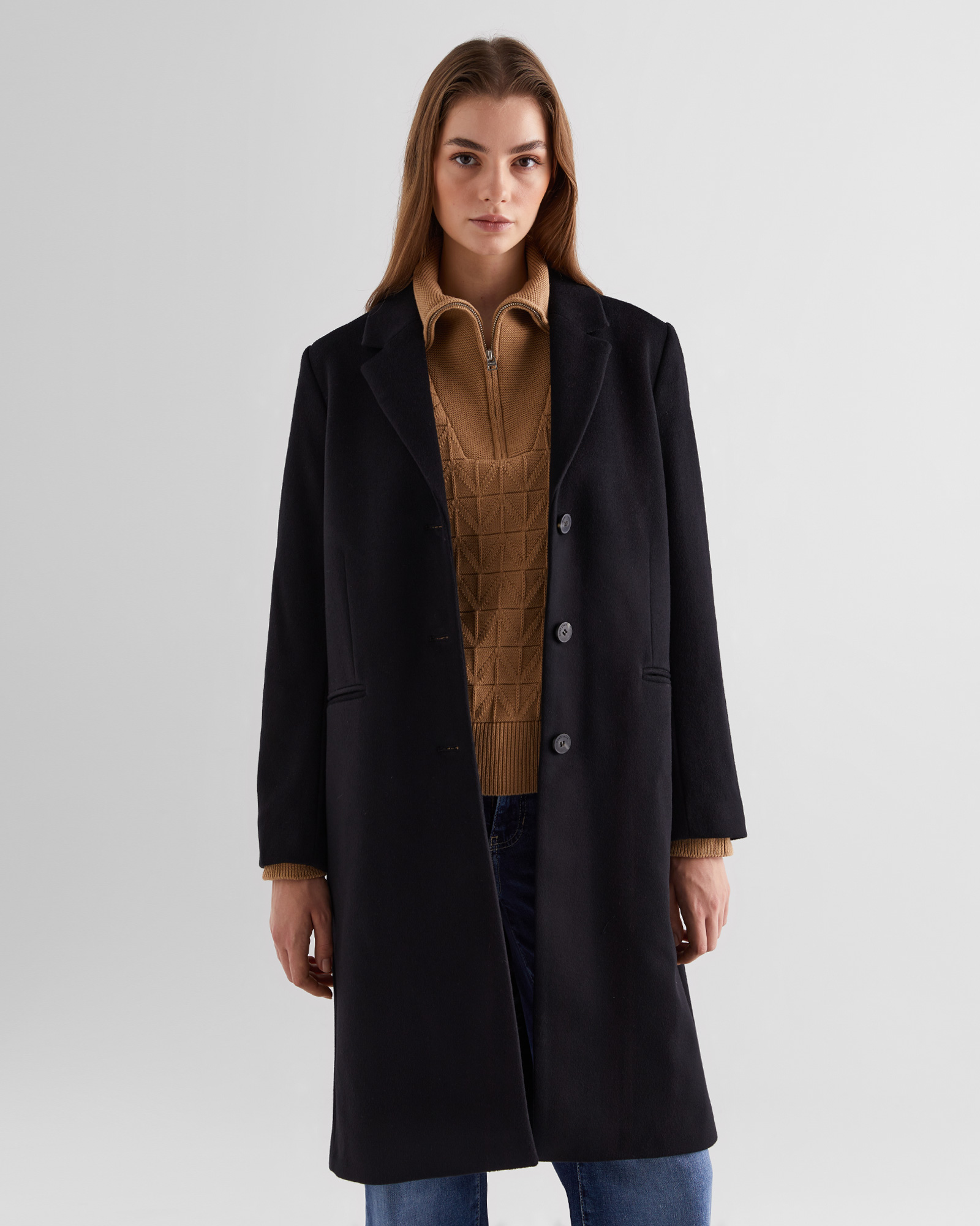 Her gardırobun ihtiyacı olan klasik bir palto. İtalyan yün karışımından üretilmiş ve onaylı viskon astarla kaplanmış şık palto, dizin hemen üstünde sonlanan regular fit kesimi ile tasarlanmıştır. Tek sıra düğmeli yapısı, klasik yaka ve yaka uçları, yüksek arka yırtmaç, çift dikişli cepler ve ön tarafta imitasyon fildişi düğmelerle detaylandırılmış.