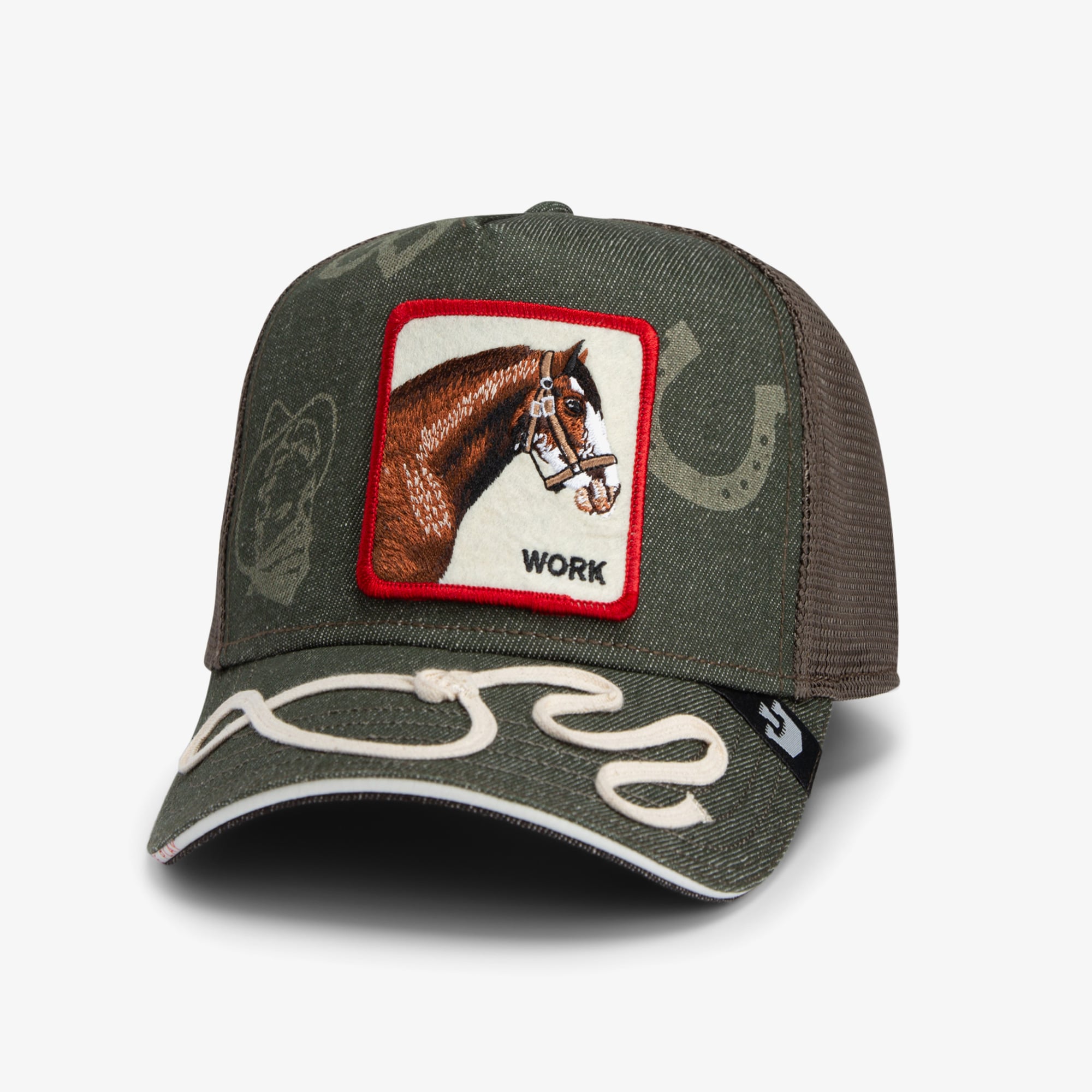 Ön panelde işleme at figürü ve "WORK" yazısı, tematik bir detay sunar