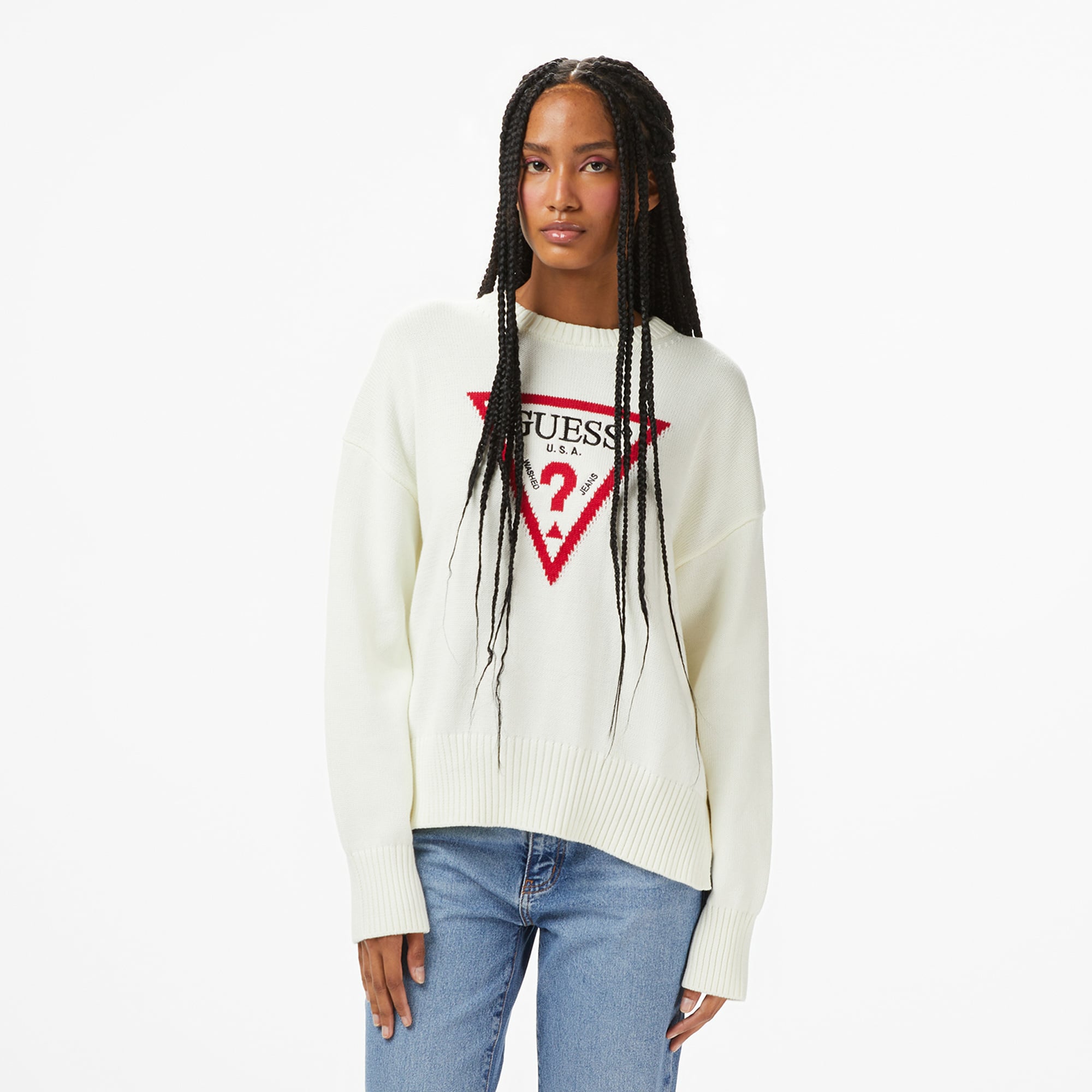 Guess Triangle Kadın Beyaz Triko, klasik kesimiyle her vücut tipine uyum sağlar.
