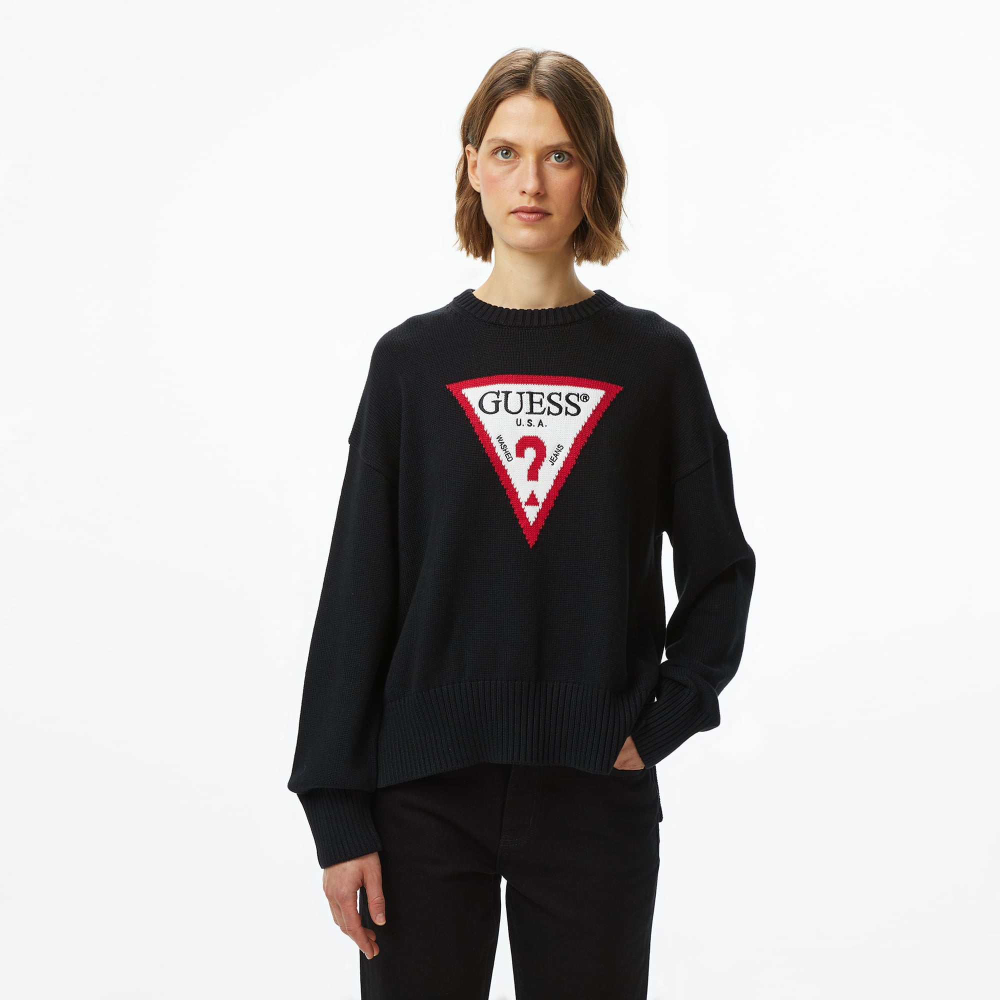 Guess Triangle Kadın Siyah Triko'nun yumuşacık dokusu, gün boyu konfor sunar.