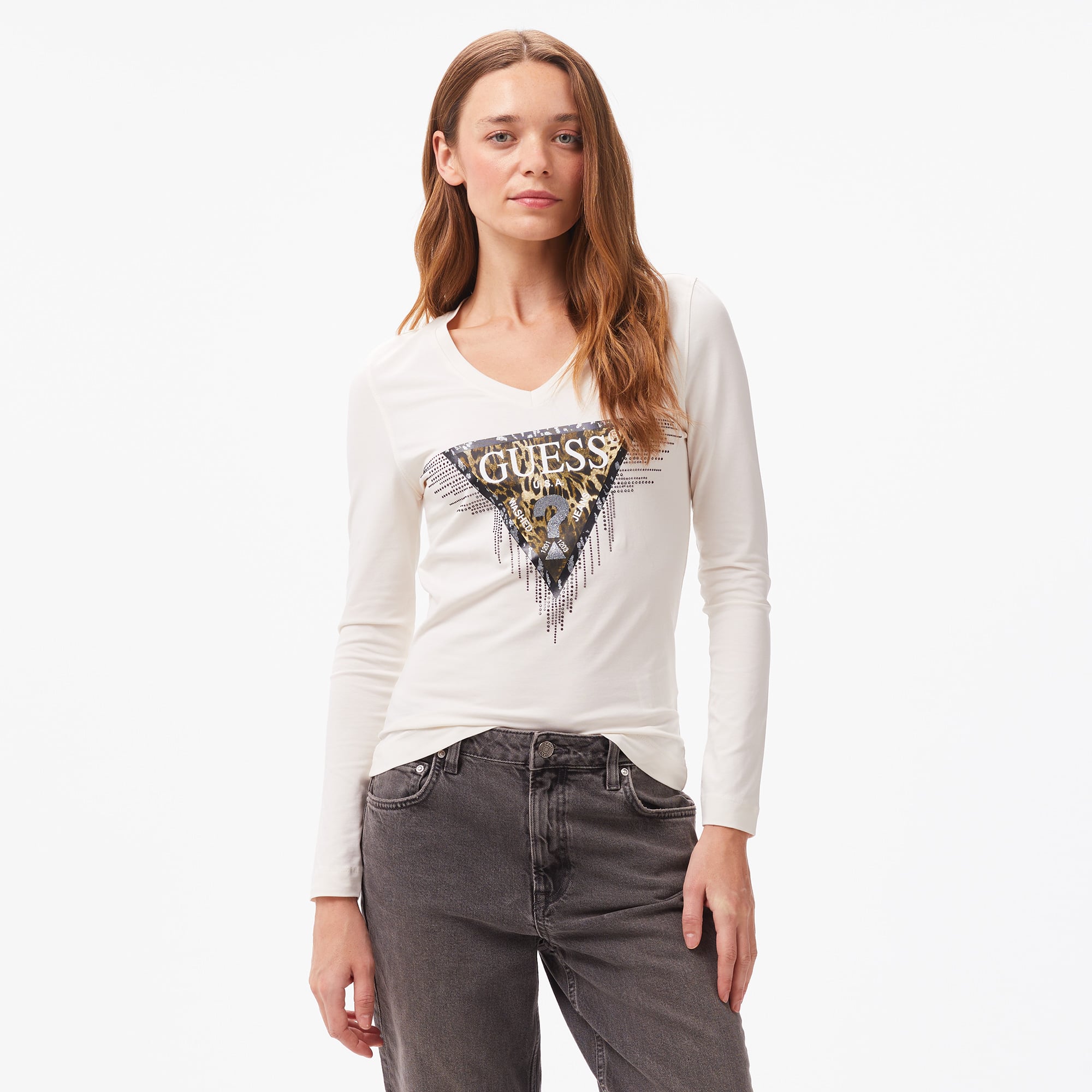 Beyaz rengi ve ikonik Guess üçgen kaplan baskısı ile dikkat çekici tasarım.