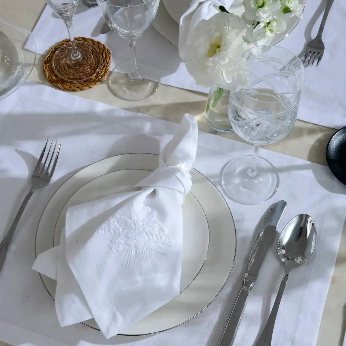 Julien 2'li Pamuk Keten Çiçek Nakışlı Peçete, beyaz renginin zarif duruşu ve ince çiçek nakış detaylarıyla sofralarınıza romantik bir hava katıyor. Pamuk ve keten karışımının doğal dokusu sayesinde hem günlük kullanıma hem de özel davetlere mükemmel uyum sağlayarak şıklığı ve estetiği bir araya getiriyor.