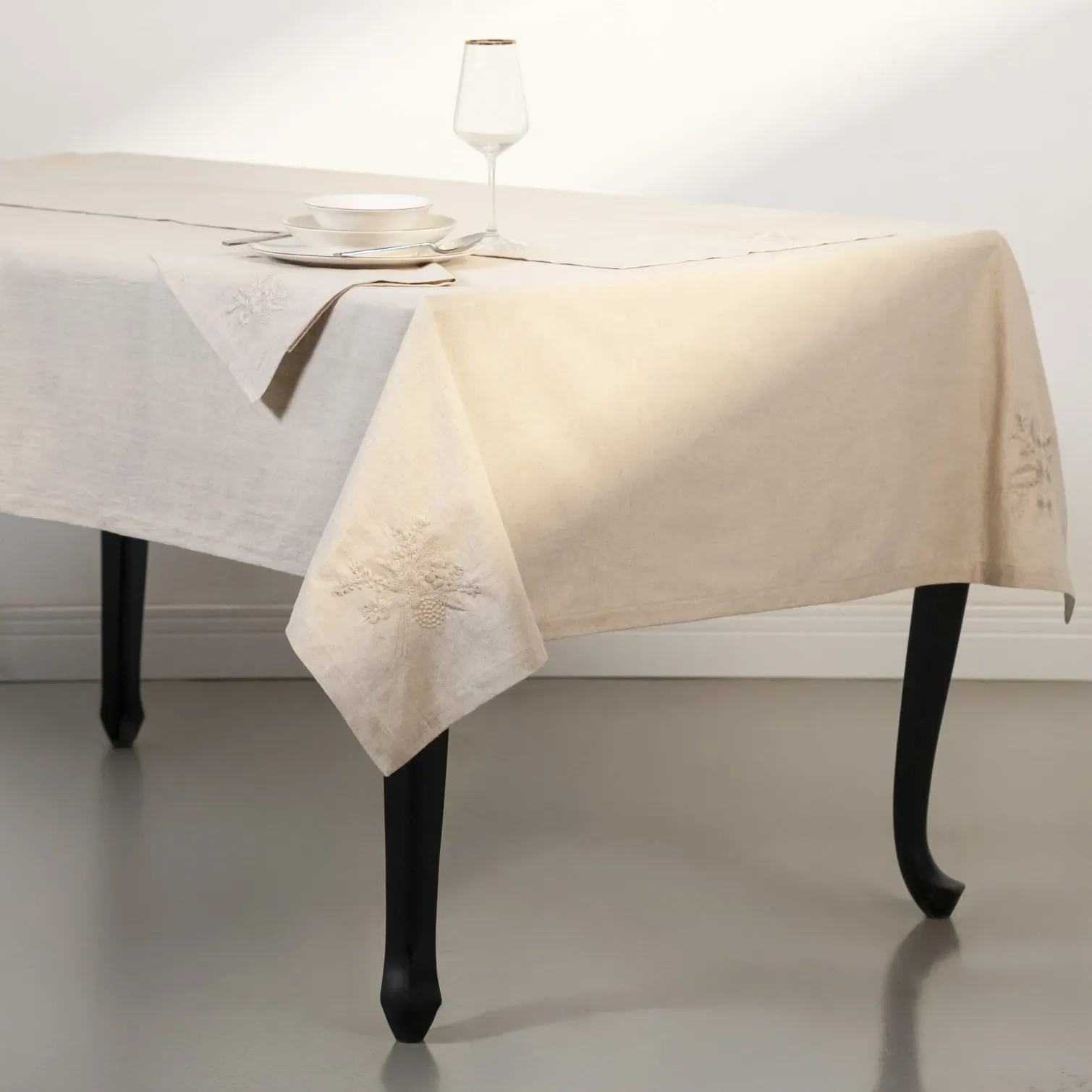 Julien Pamuk Keten Çiçek Nakışlı Masa Örtüsü Ekru 150x250 cm