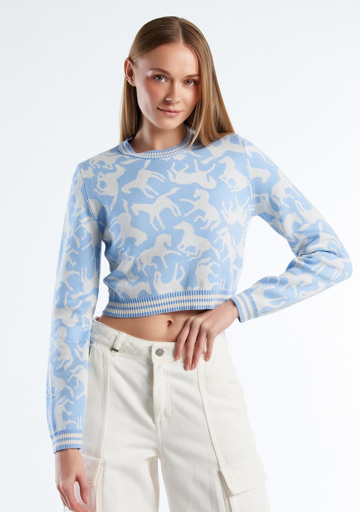 Yumuşak saf pamuk iplikten üretilmiş, uzun kollu, bisiklet yaka kadın kazak. At motifli özel jakarlı örgüsüyle dikkat çekici bir tasarıma sahip. Özgünlüğü vurgulayan yenilikçi stiller inşa etmek isteyenler için eşsiz bir seçenek.