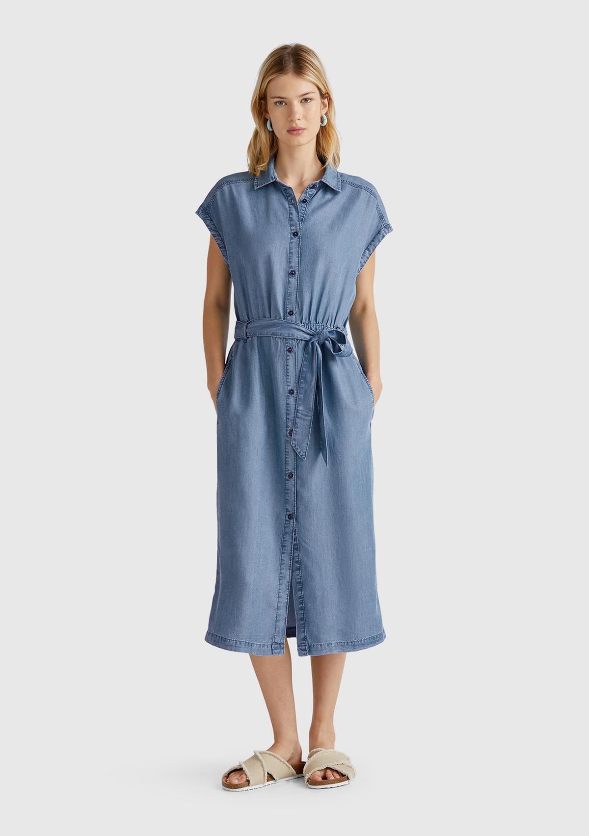 Kadın Açık Mavi %100 Liyosel Polo Yaka Belden Bağlamalı Midi Elbise