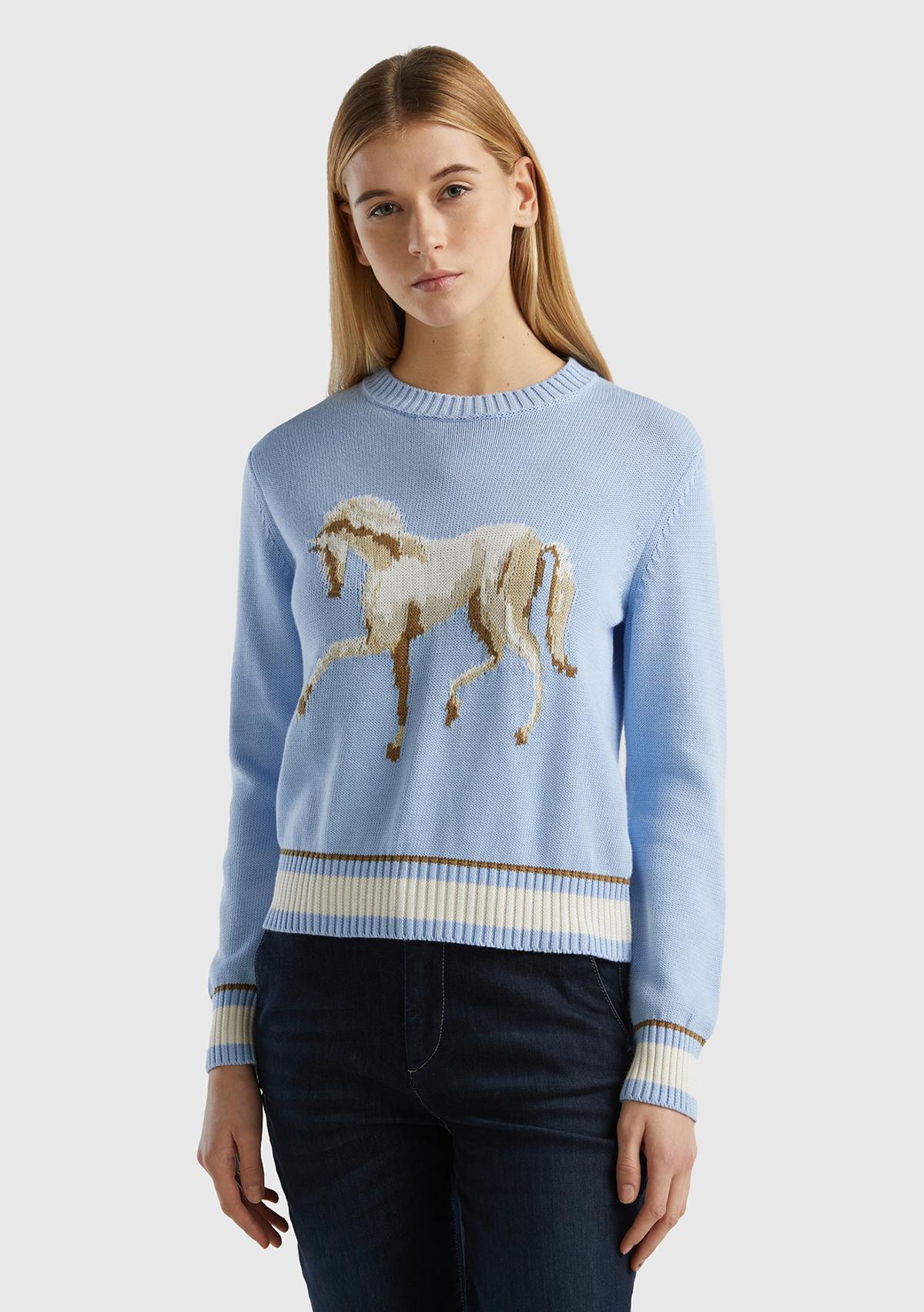 Kadın Açık Mavi %100 Pamuk Kontrast At Baskılı Bisiklet Yaka Kazak