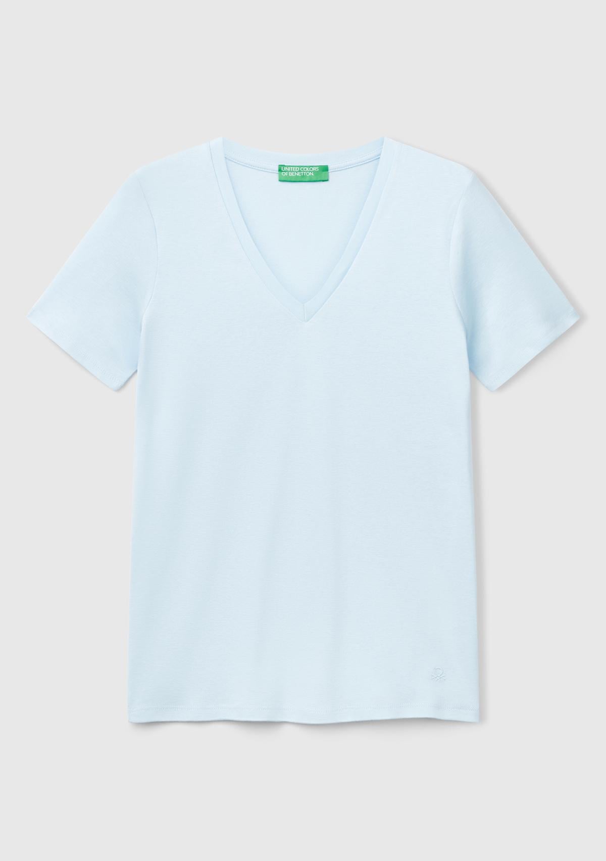 Kadın Açık Mavi %100 Pamuk V Yaka Basic T-Shirt