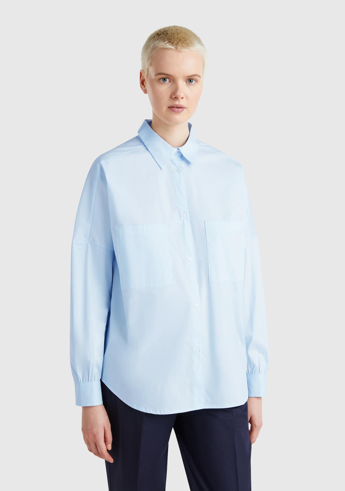 Kadın Açık Mavi Pamuk Karışımlı Kolu Büzgülü Düşük Omuzlu Oversize Gömlek