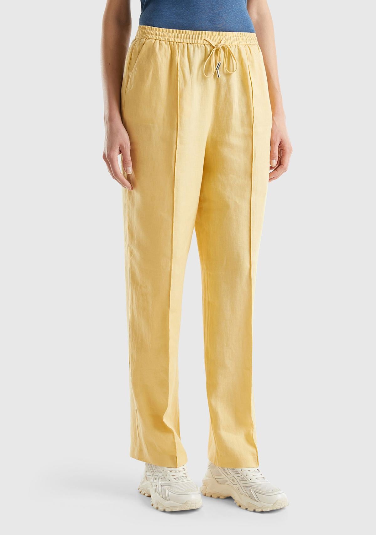 Kadın Açık Sarı %100 Keten Beli İpli Rahat Kalıp Pantolon