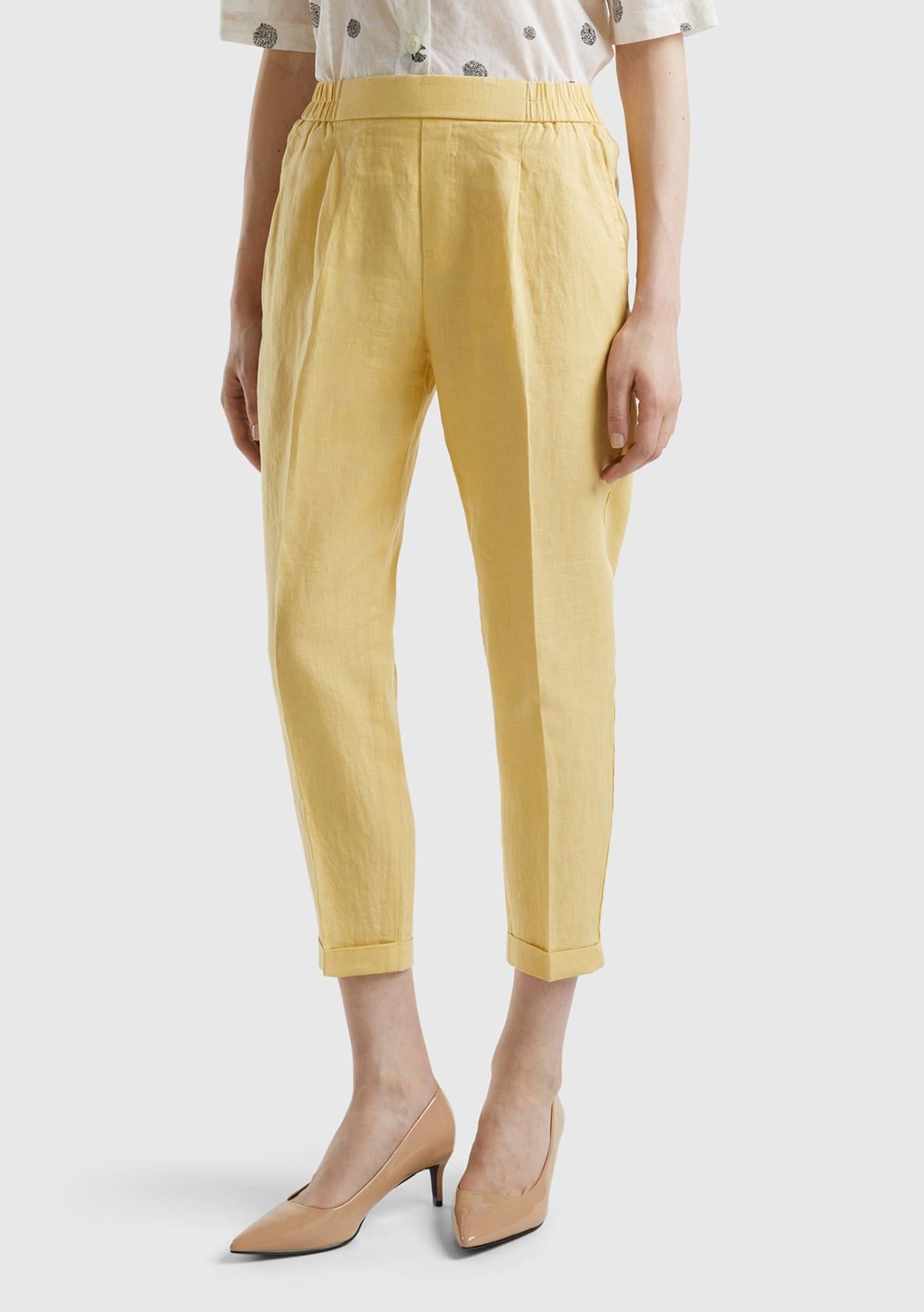 Kadın Açık Sarı %100 Keten Beli Lastikli Pantolon