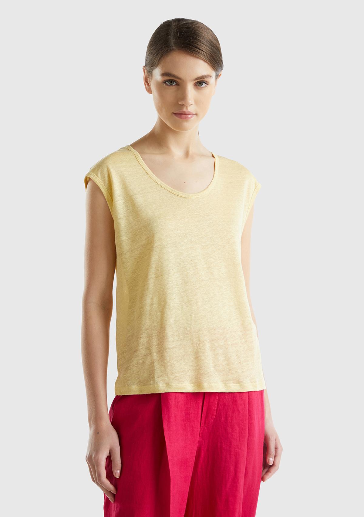 Kadın Açık Sarı %100 Keten Rahat Kalıp Geniş Bisiklet Yaka Kolsuz T-Shirt
