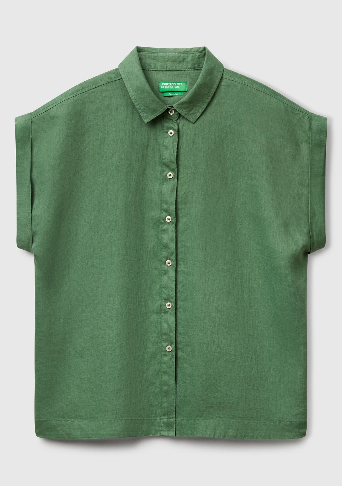 Kadın Açık Yeşil %100 Keten Omuz Detaylı Kısa Kollu Gömlek