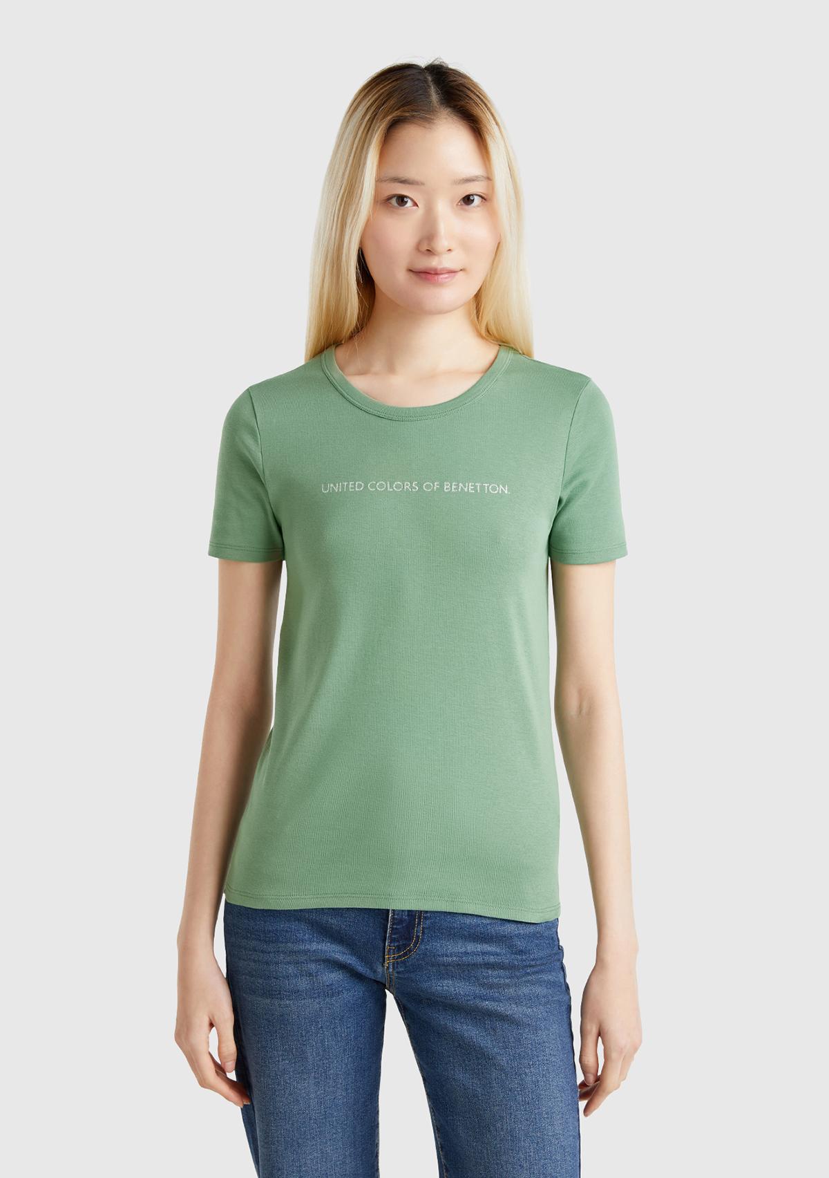 Kadın Açık Yeşil %100 Koton Benetton Yazılı Basic T-Shirt