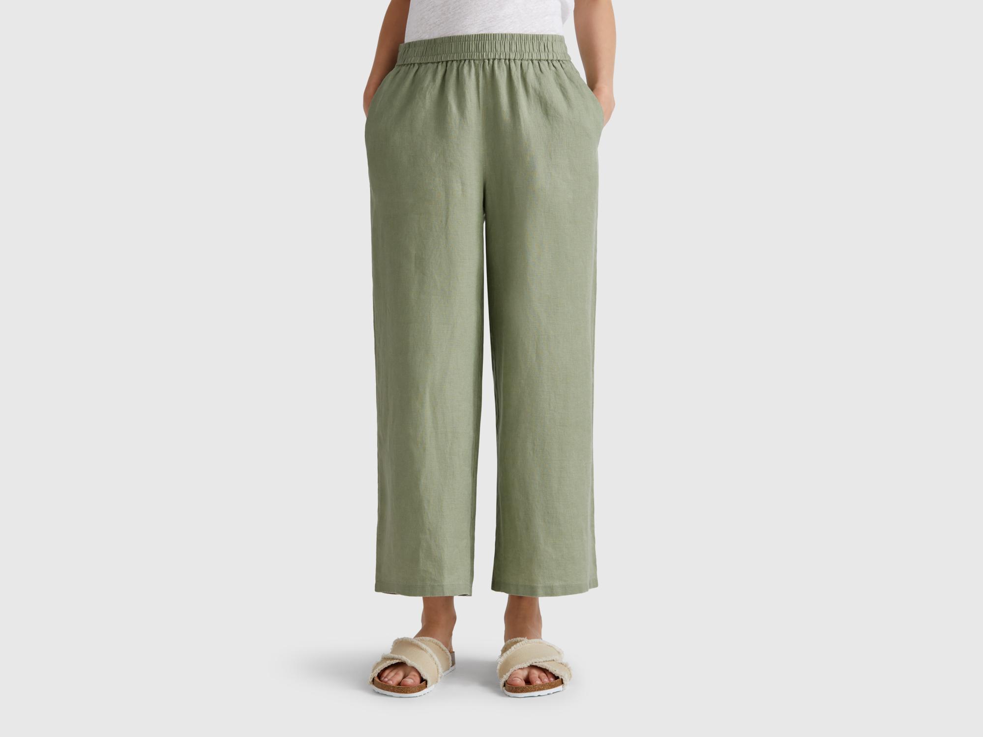 Kadın Adaçayı yeşili %100 Keten Beli Lastikli Bol Kısa Paça Pantolon