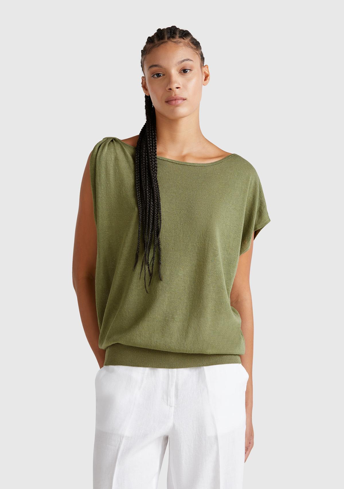 Kadın Adaçayı yeşili Keten Karışımlı Asimetrik Kolsuz Kazak