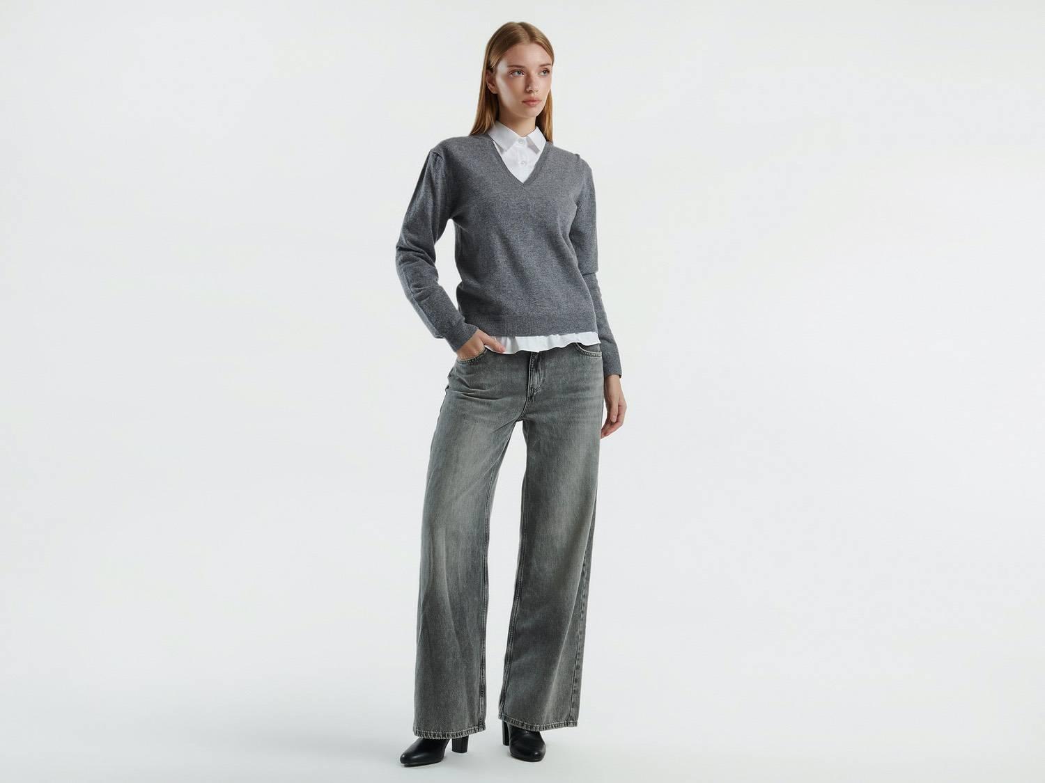 Kadın Antrasit Melanj V Yaka %100 Merino Kazak. Koyun Yünü İçerir