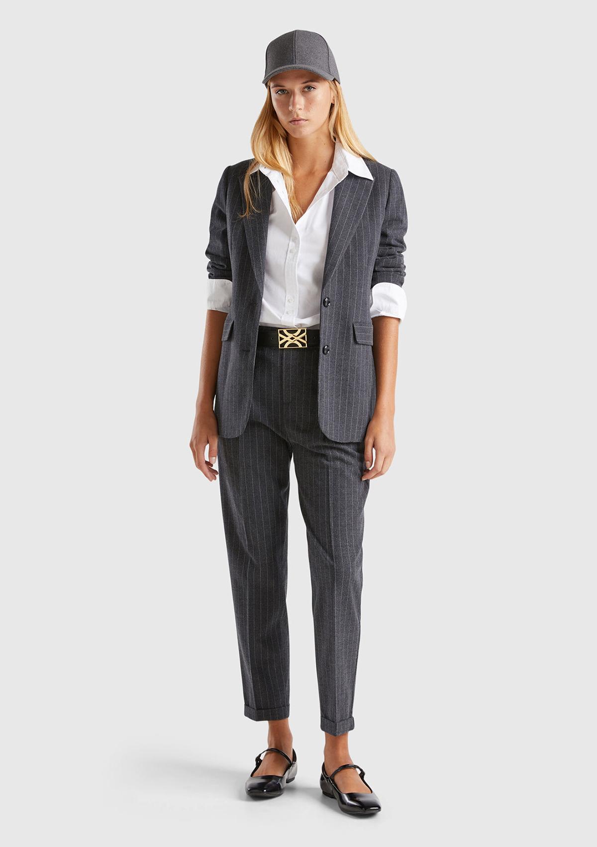 Kadın Antrasit Viskoz Karışımlı Düğme Kapamalı Çizgili Sivri Yaka Blazer Ceket