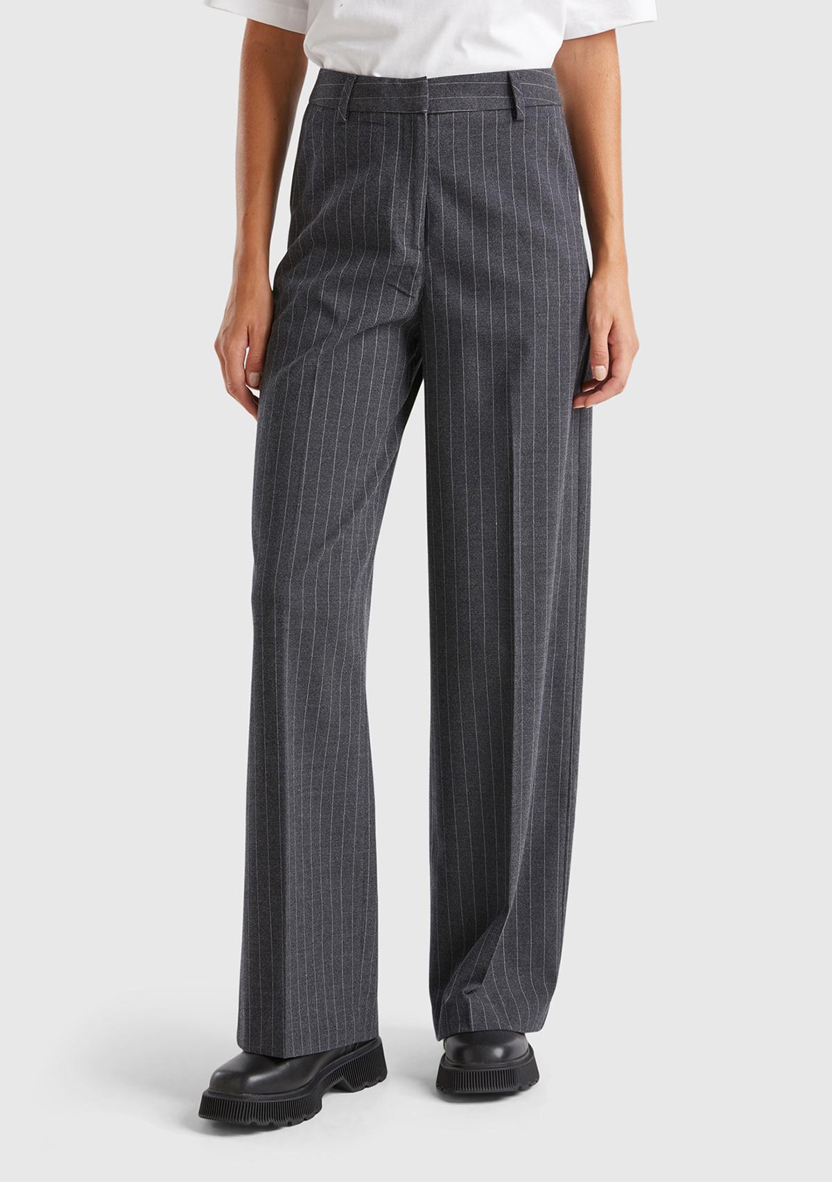 Kadın Antrasit Viskoz Karışımlı Önü Cepli İnce Çizgili Geniş Paça Pantolon
