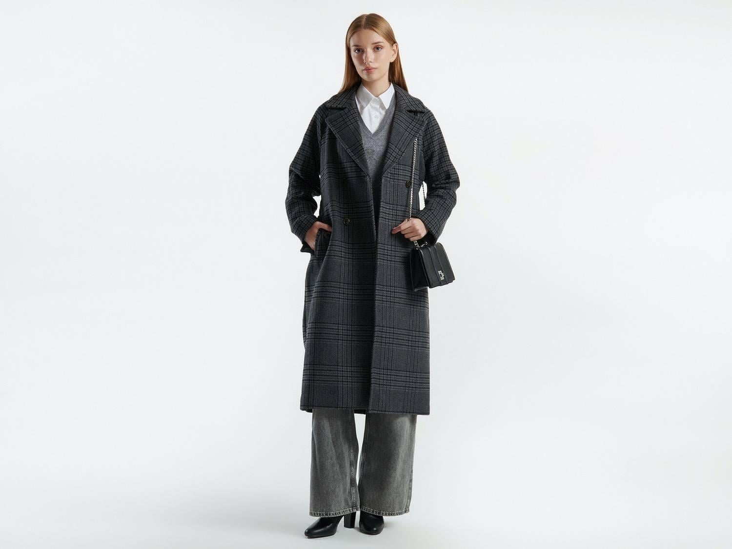 Kadın Antrasit Yün Karışımlı Kemer Bantlı Tamamı Desenli Dik Yaka Kaban