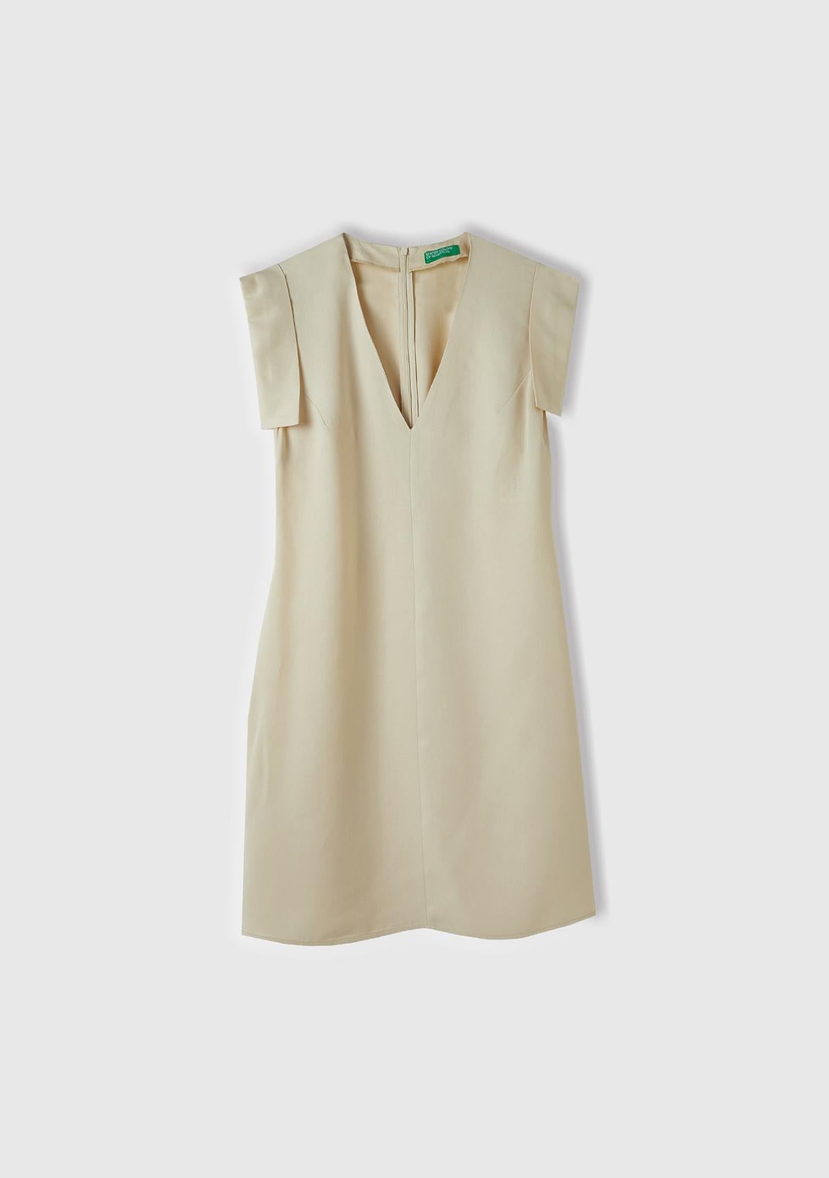Kadın Bej %100 Liyosel Beli Daralan Yandan Fermuarlı V Yaka Elbise