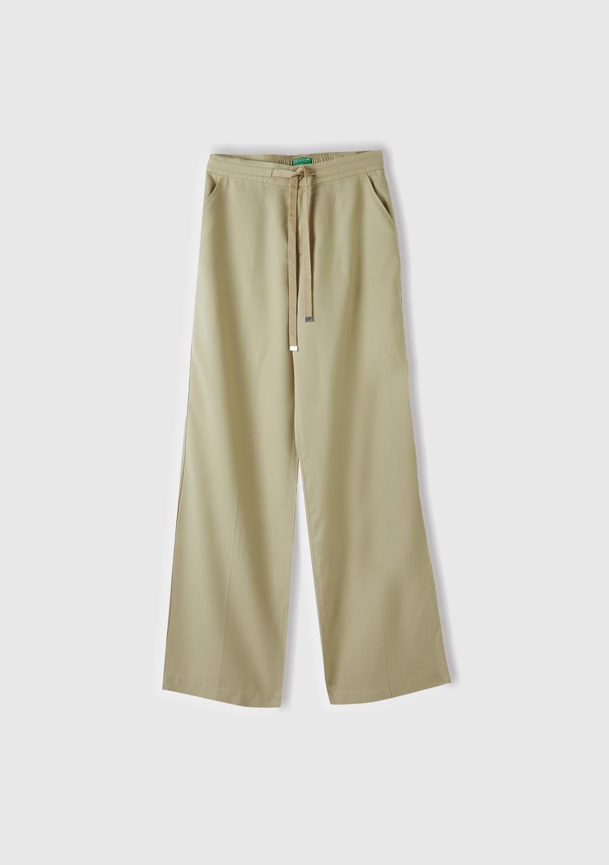 Kadın Bej %100 Liyosel Önü Pileli Beli İpli ve Düğmeli Pantolon
