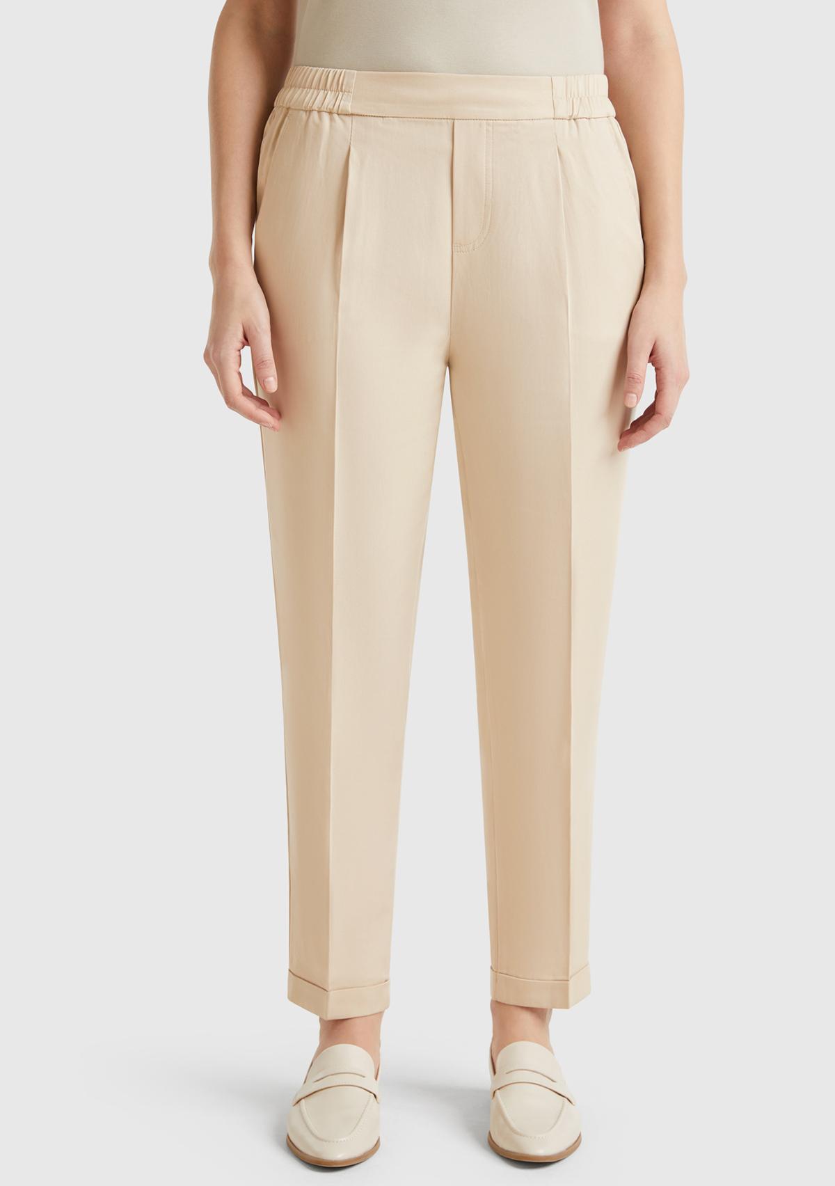 Kadın Bej %100 Liyosel Paçası Kıvrımlı Beli Lastikli Pantolon