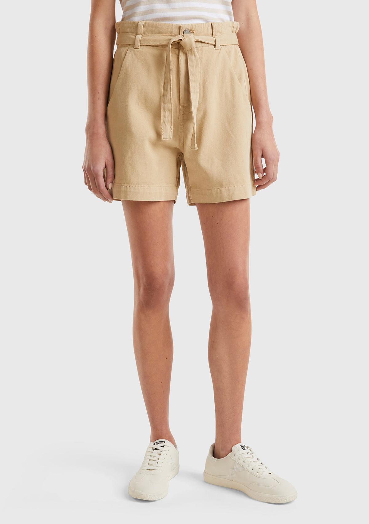 Kadın Bej %100 Pamuk 2 Cepli Kemer Detaylı Beli Büzgülü Bermuda Şort