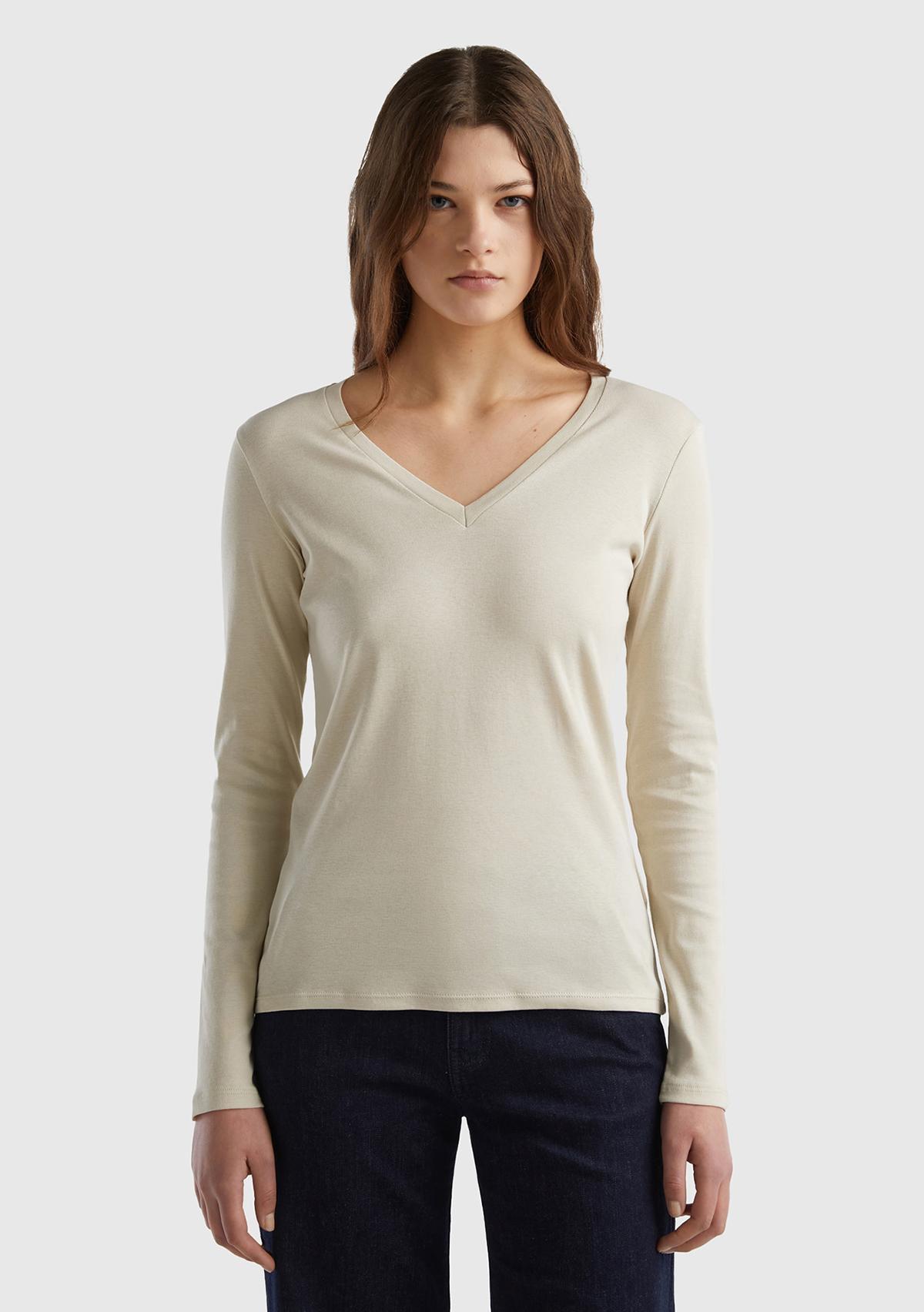 Kadın Bej Basic V Yaka Uzun Kollu T-Shirt