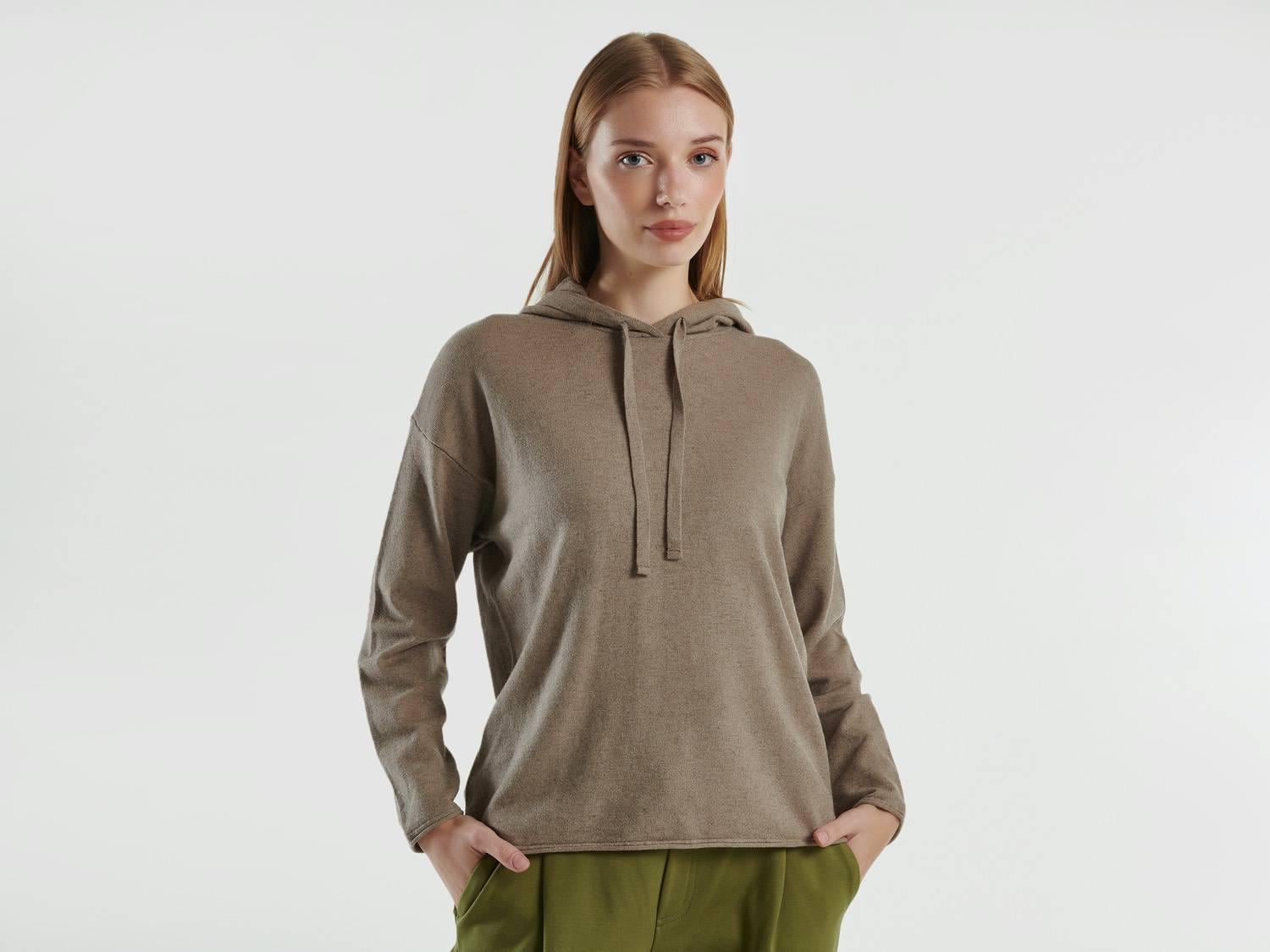 Kadın Bej Kaşmir Karışımlı Kapşonlu Kazak. Koyun-Keçi Yünü İçerir
