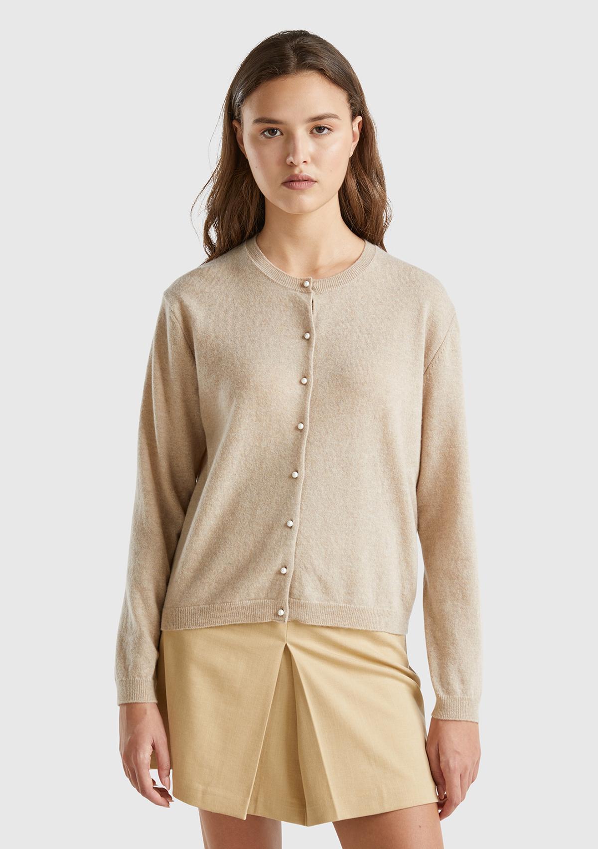 Kadın Bej Melanj Bisiklet Yaka %İnci Düğmeli Merino Hırka. Koyun Yünü İçerir