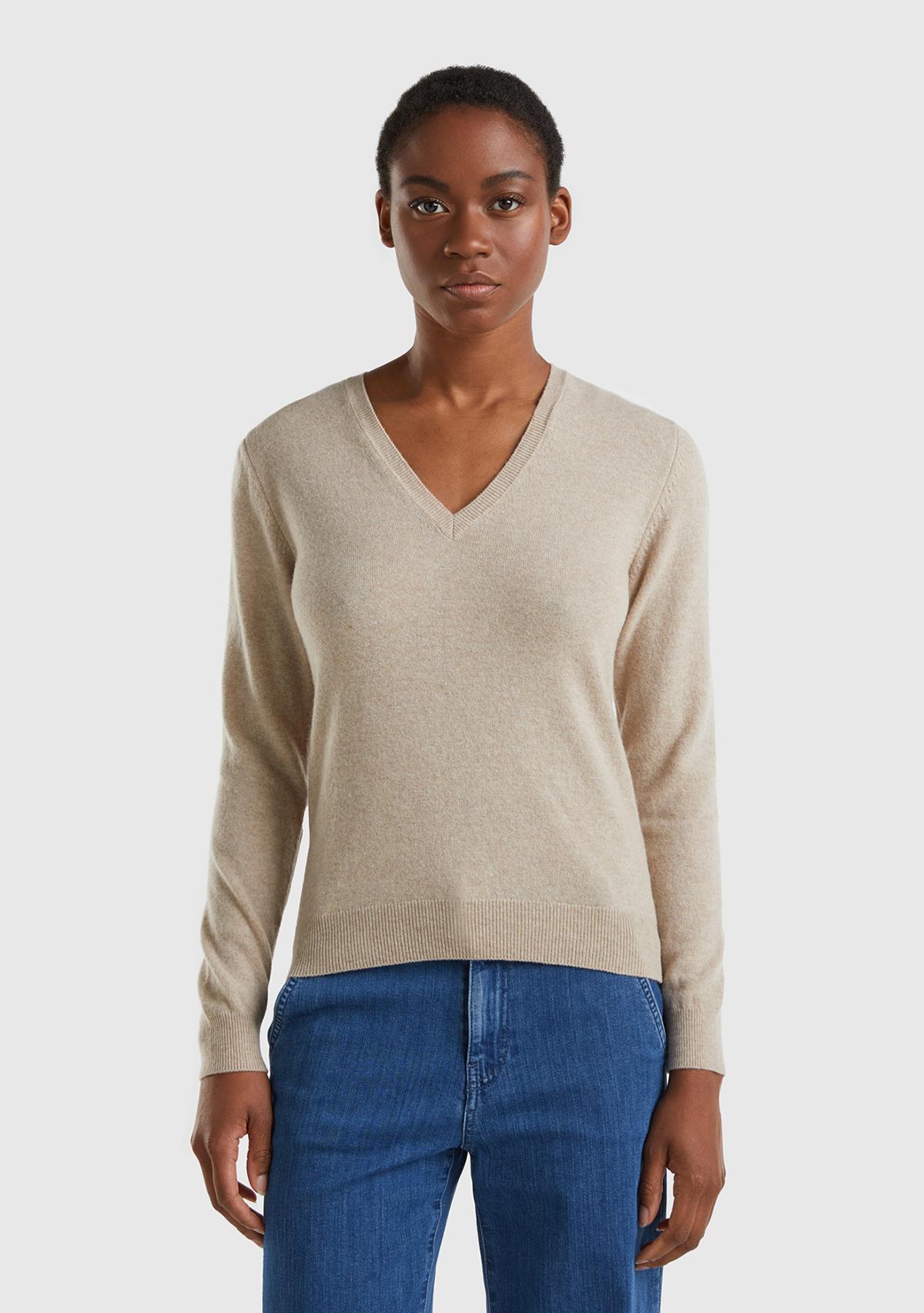 Kadın Bej Melanj V Yaka %100 Merino Kazak. Koyun Yünü İçerir