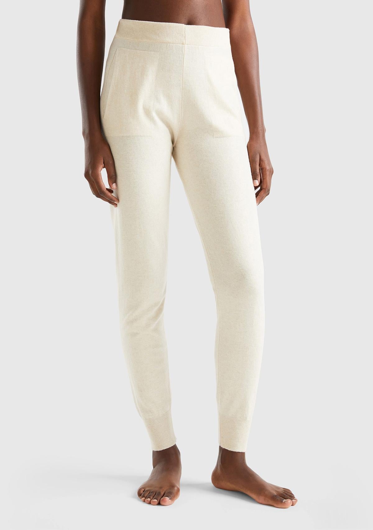 Kadın Bej Paçası Lastikli Kaşmir Karışım Pantolon