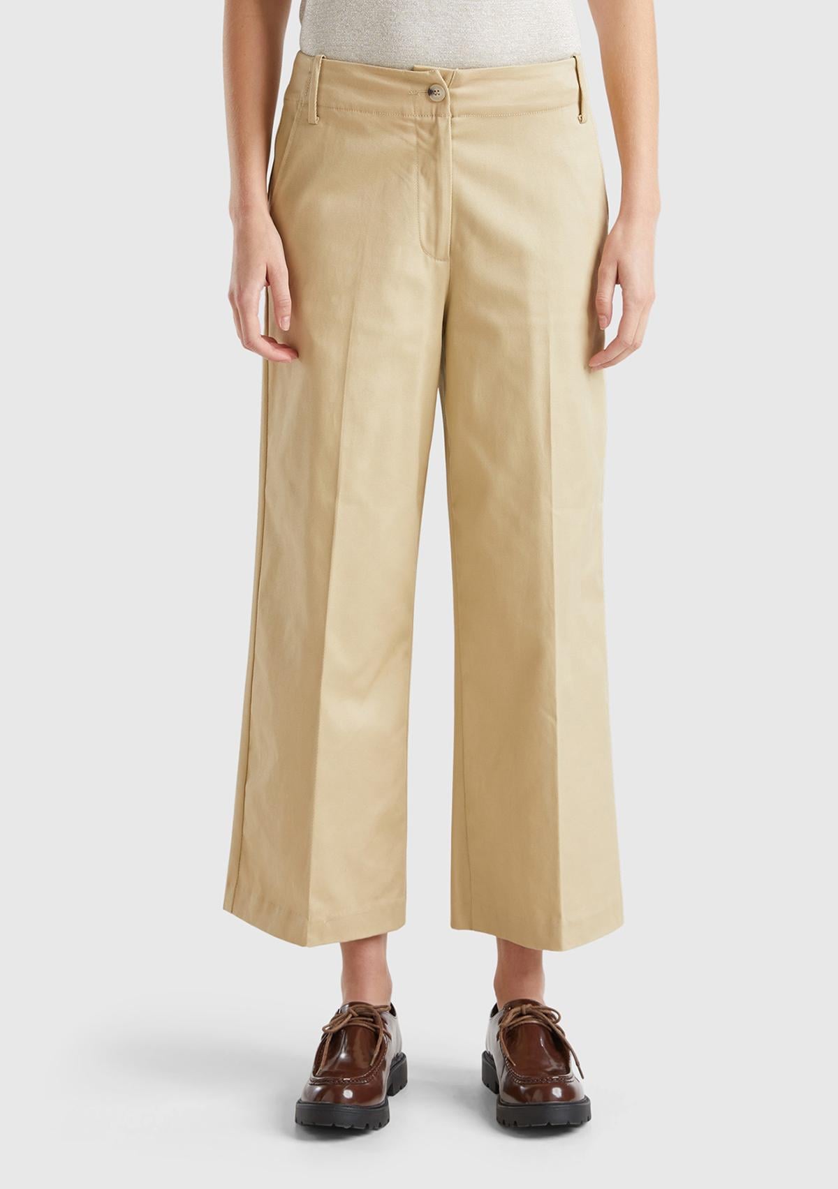 Kadın Bej Pamuk Karışımlı Arkası Düğmeli Cepli Bol Paça Pantolon