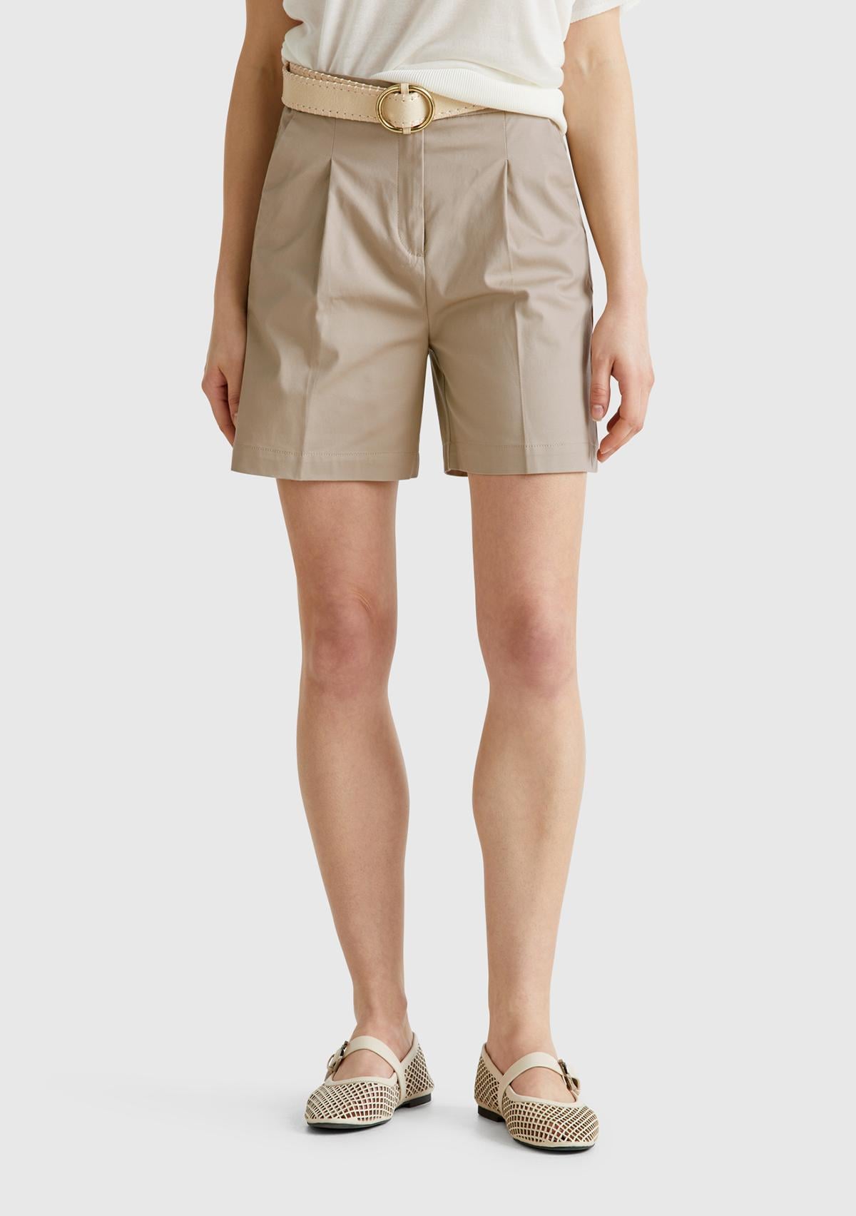 Kadın Bej Streç Pamuklu Arka Beli Lastikli Straight Fit Bermuda Şort